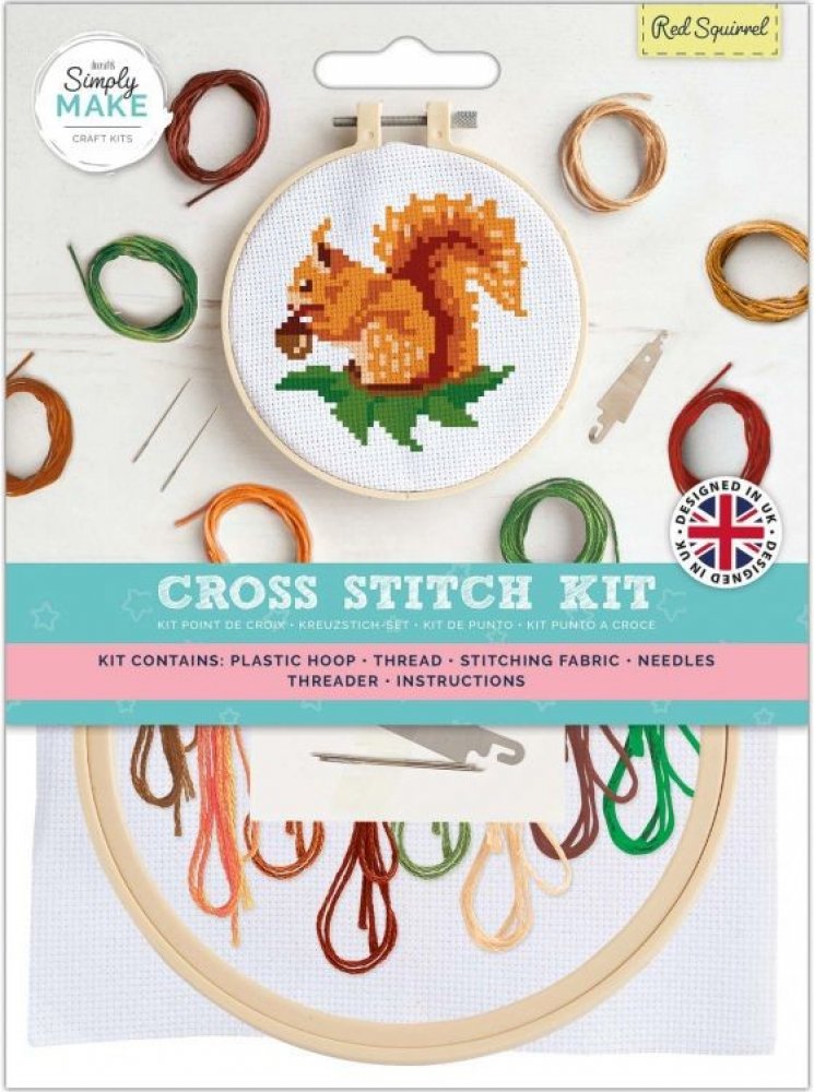 Praktická sada Simply Maple Red squirrel, kde je vše na vyšívání obrázku včetně vyšívacího rámečku. Sada obsahuje: plastový vyšívací kruh, 8 barev přízí na vyšívání, látka na vyšívání, 2 jehly, navlékač příze a návod včetně vyšívaného vzoru.
