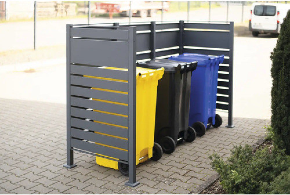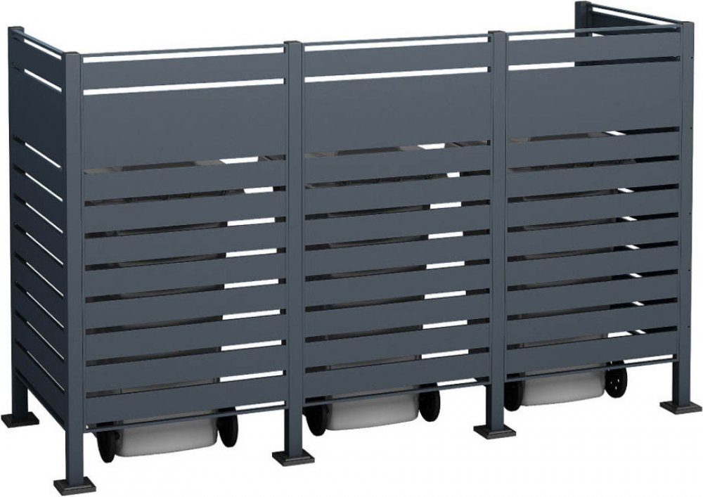 Kovová skříň na odpadky Westmann Planum | 3x240 l | antracit | 250x90x150 cmModerní a funkční - minimalistická skříň na odpadkové koše Planum od společnosti Westmann umožní, aby vaše odpadkové koše během okamžiku zmizely za nadčasovou ocelovou konstrukcí s práškovým nástřikem.Málokterý jiný předmět denní potřeby je tak nezbytný, ale zároveň vizuálně nepopulární jako odpadkový koš. S krytem odpadkových košů Planum od společnosti Westmann řešíme právě tento problém! Moderní kryt odpadkového koše šikovně ukryje vaše odpadkové koše za tmavě šedou ocelovou zástěnu, která je vzadu a nahoře otevřená. Kryt na odpadkový koš Planum je navíc univerzálním řešením 2 v 1, protože kromě toho, že opticky zvýrazňuje odpadkový koš, plní kryt v závislosti na velikosti a umístění také funkci dekorativní zástěny pro ochranu soukromí. Vaše odpadkové koše zůstávají přístupné díky otevřené konstrukci, která usnadňuje likvidaci odpadu. Můžete jej také využít jako alternativní úložný nebo odkládací prostor pro kola, košťata apod.Poznámka: Aby kryt na odpadkové koše získal větší stabilitu, měly by být sloupky mobilní konstrukce připevněny k pevnému povrchu pomocí přiložených vrtáků.Speciální vlastnosti:Vložka do koše a zástěna pro ochranu soukromí Moderní a nadčasový design Prostor pro 3 odpadkové koše, každý o objemu 240 litrů Tělo z práškově lakovaného ocelového plechu Robustní a odolné Modulárně rozšiřitelný Předvrtané montážní díly Jednoduchá montáž