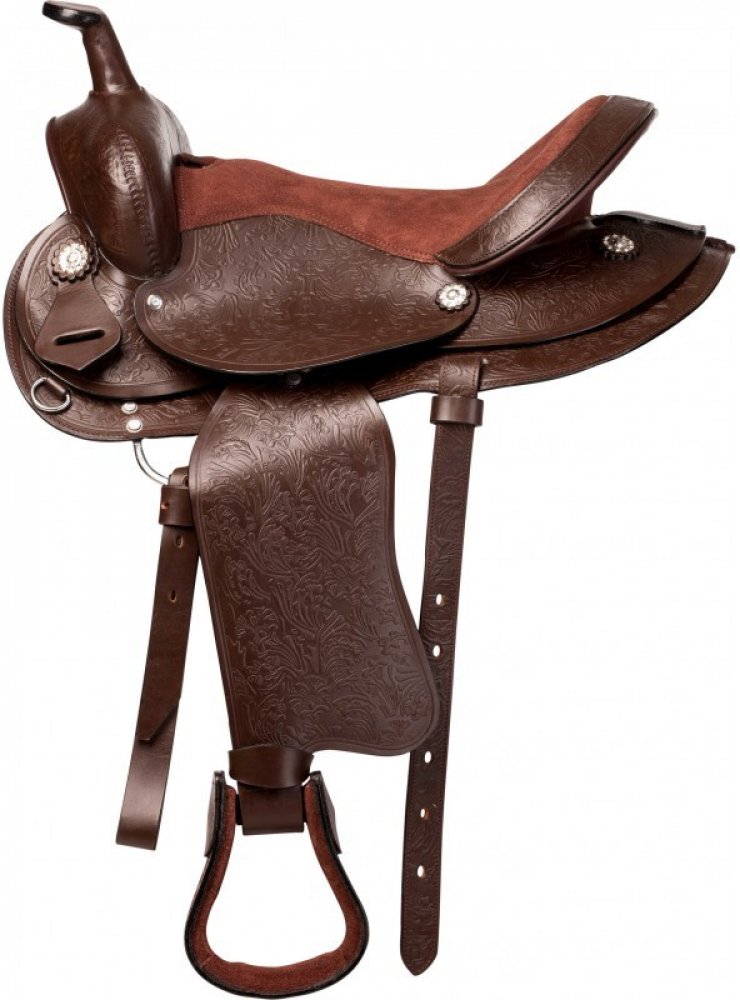 Westernové sedlo zdobené raženými květinovými vzory s laminátovou kostrou typu Roper. Hranaté bočnice, semišové posedlí a zadní rozsocha ozdobené stejnými květinovými motivy. Tradiční kravatový systém zapínání podbřišníku. Přední podbřišník je provázkový a zadní je kožený. Dřevěné třmeny potažené semišem a buvolí kůží.