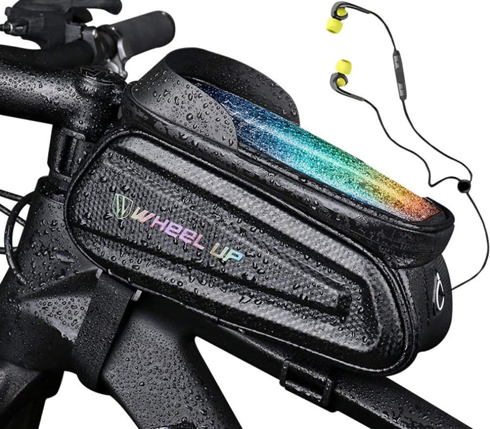 Velká, pevná brašna na rám kola s dotykovým okénkem pro mobil. Vhodná i pro opravdu velký smartphone. Maximální rozměry telefonu 186x90x25mm (otestováno). Bohatý prostor pro uložení věcí, brašna má objem 1,5l. Síťované přihrádky na stěnách uvnitř brašny. Předek je opatřen vývodem na sluchátka. Voděodolný zip s pogumovanými packami, které při jízdě na kole necinkají. Stínicí lišta pro lepší čitelno...