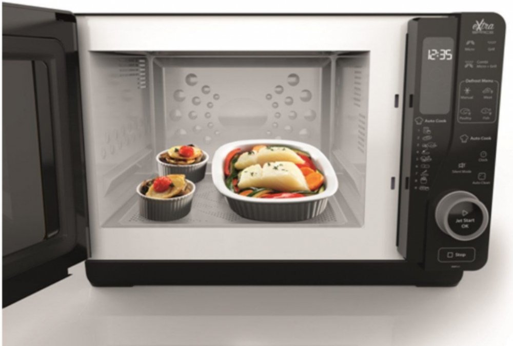Mikrovlnná trouba má také spoustu užitečných funkcí. Elektronické dotykové ovládaní + otočný knoflík, funkce JetStart, Defrost, Gril, kombinace mikrovln a grilu, AUTO Cook - možnost použití automatických receptů