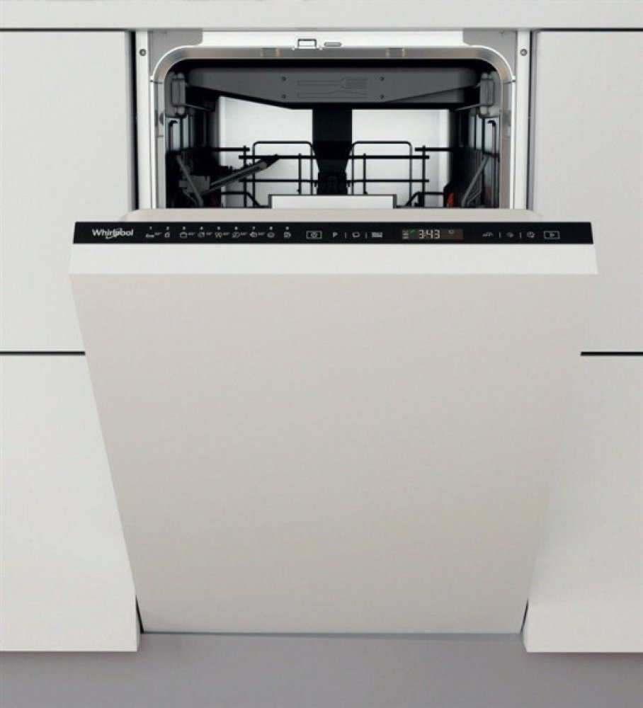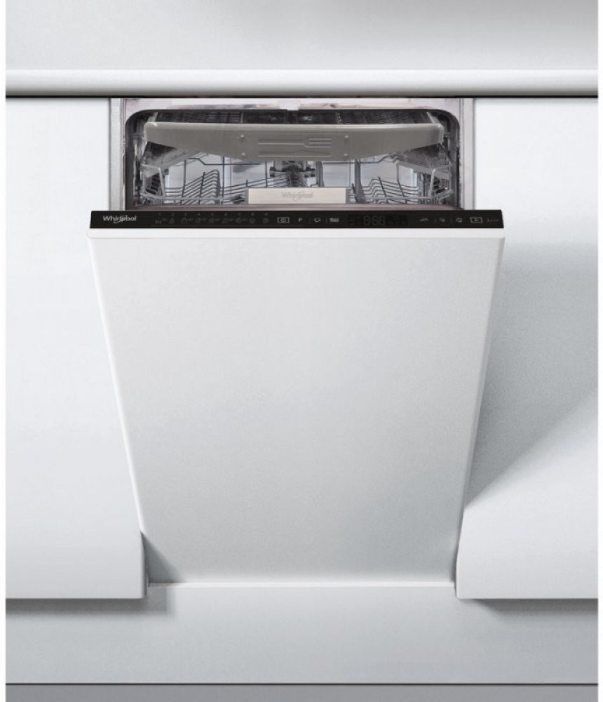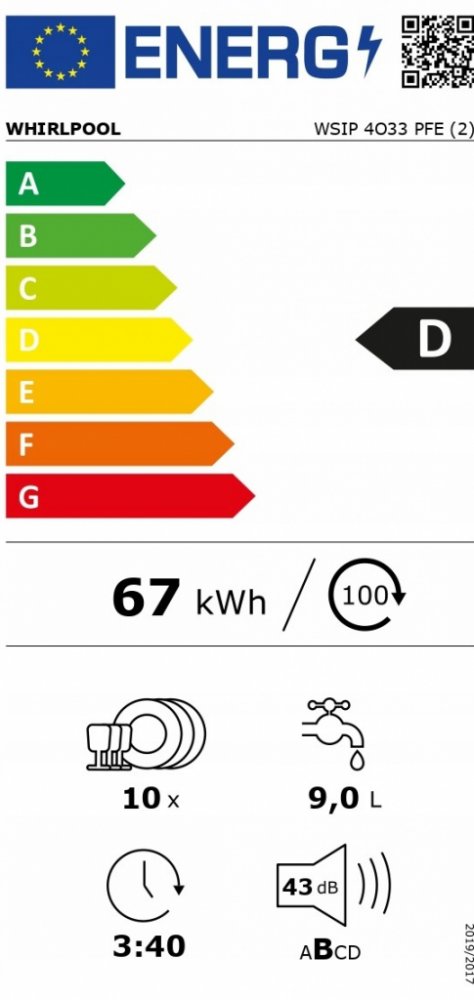 Whirlpool WSIP 4O33 PFE. Umístění spotřebiče: Plně vestavěné, Velikost produktu: Slim (45 cm), Barva dvířek: Černá. Počet míst: 10 kompletních, Hlučnost: 43 dB, Mycí programy: Economy, Sklo/Sensitive, Intenzivní 65 ºC, Předmytí, Rychlý. Spotřeba vody na cyklus: 9 l, Stupnice energetické účinnosti: A +++ až C, Spotřeba energie na cyklus: 0,659 kWh. Šířka produktu: 448 mm, Hloubka produktu: 555 mm, Výška produktu: 820 mm. Kategorie sušení: A, Roční spotřeba energie: 189 kWh, Roční spotřeba vody: 2520 l