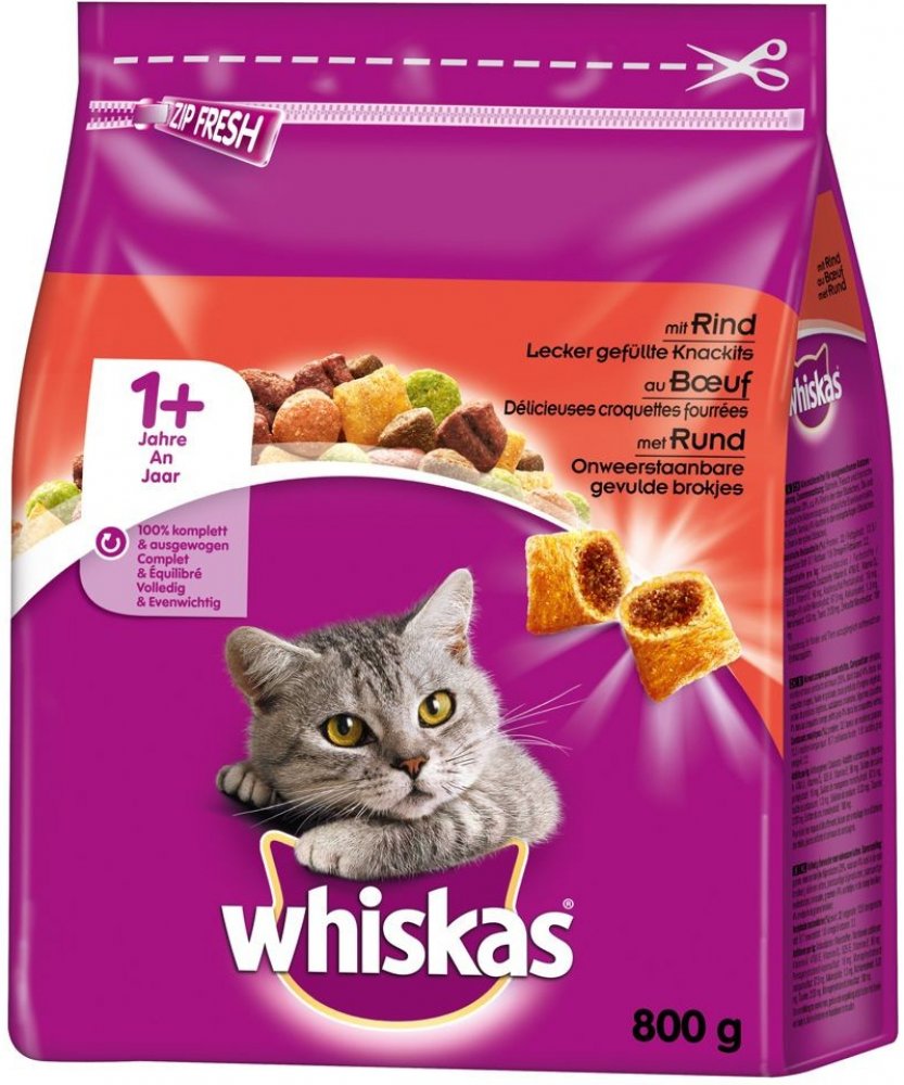 Kočky jsou od přírody gurmáni, milují rozmanitost ve své stravě. Obzvláště rádi mají bohatou, aromatickou chuť masa. Proto obsahuje Whiskas 1+ Hovězí křupavé kousky Knackits s vynikající masovou náplní s játry. Spolu s obsaženým hovězím masem je toto jídlo opravdu voňavé a bude Vašemu čtyřnožci velmi chutnat. Navíc Whiskas zcela vynechává v tomto vlhkém krmivu umělá aromata. Můžete hýčkat svého oblíbence bez špatného svědomí denně a zdravým způsobem. Díky přidaným nezbytných vitamínům a minerálům je krmivo vyvážené a kompletní. Poskytuje vše, co kočka potřebuje pro zdravý, aktivní život. Speciální formule Dental Protection pomáhá k udržení zdravých zubů a tím podporuje silný skus. Díky praktickému zapínání na zip zůstane jídlo čerstvé a křupavé opravdu dlouho. Whiskas 1+ Hovězí v přehledu: Delikátní kompletní krmivo pro dospělé kočky všech plemen S chutnými játry a hovězím S křupavými Knackits: aromatické masité, s měkkou náplní pod křupavou vrstvou pro větší požitek a změnu Zcela bez umělých aromat Dental Protection formule: na podporu zdravých zubů, pro silný skus S důležitými vitamíny a minerály: vyvážená a kompletní výživa pro Vašeho mazlíčka S praktickým uzávěrem na zip pro dlouhotrvající čerstvost