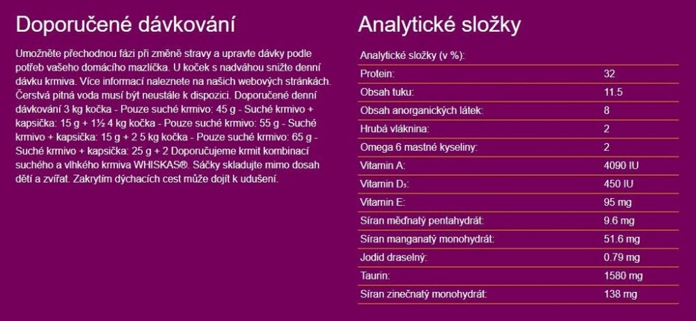 Doporučené dávkování: Kočka o hmotnosti 3 kg potřebuje 45-50 g suchého krmiva denně, kočka o hmotnosti 4 kg potřebuje 55-65 g suchého krmiva denně, kočka o hmotnosti 5 kg potřebuje 65-75 g suchého krmiva denně. 15 g suchého krmiva můžete nahradit 1 85 g kapsičkou mokrého krmiva WHISKAS®