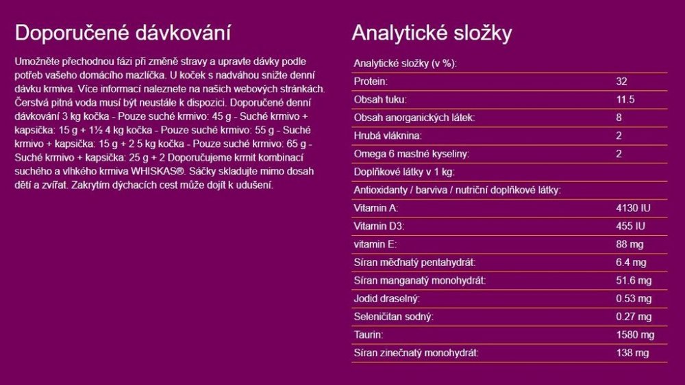 Kompletní krmivo pro dospělé kočky. Granule Whiskas pro dospělé kočky podávejte suché, nevlhčené. Zajistíte tak dentální hygienu pro vaši kočku. Každá granule Whiskas má svoji specifickou vlastnost. Barevné granule jsou obohaceny o zeleninu, tmavé pak o maso. Jedinečné masové polštářky jsou křehké,křupavé a plněné měkkou pastou . Granule whiskas jsou nejznámější granule střední kvality pro kočky s jedinečnou recepturou, bez uměle přidaných dochucovadel. Zaměřeny na zdraví močových cest, zubů, zraku i kvalitu srsti.