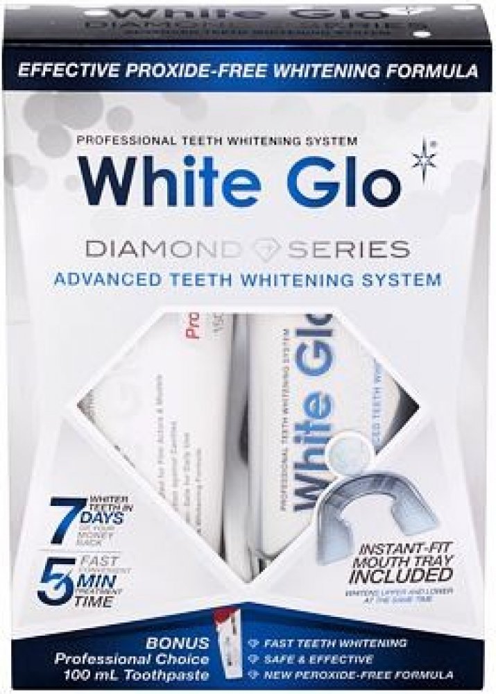 White Glo Diamond Series Advanced teeth Whitening System. White Glo Diamond Series Advanced Teeth Whitening System je sada pro moderní a bezpečné bělení zubů. Neobsahuje žádné drastické přísady jako je peroxid a jiné podobné látky. Obsahuje pouze testované a stomatologicky schválené přísady, jejichž používání nepoškozuje zubní sklovinu, ani dásně. Co tuto sadu na bělení zubů tvoří? ### Profesionál