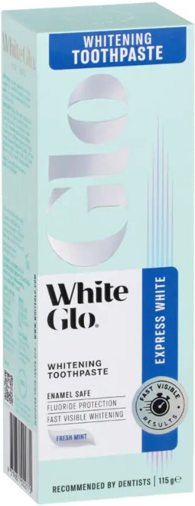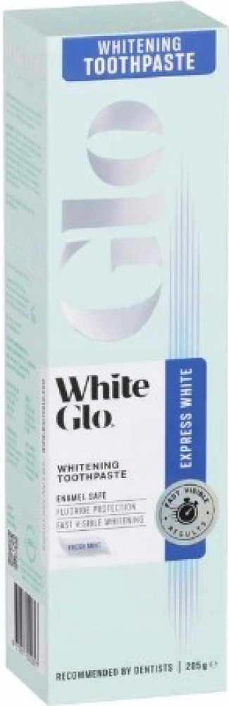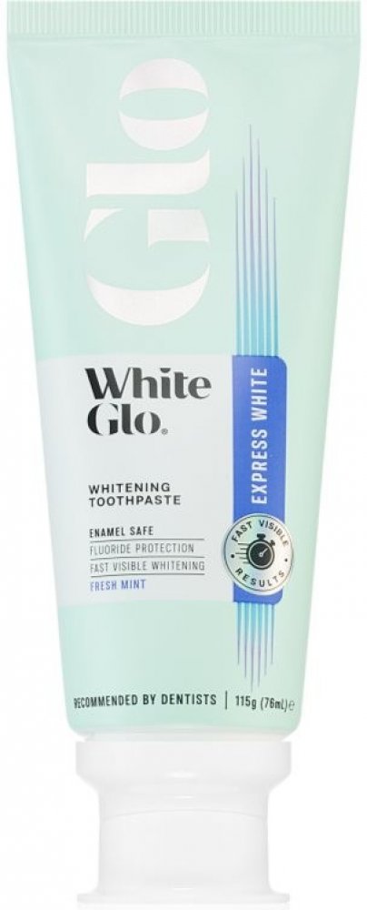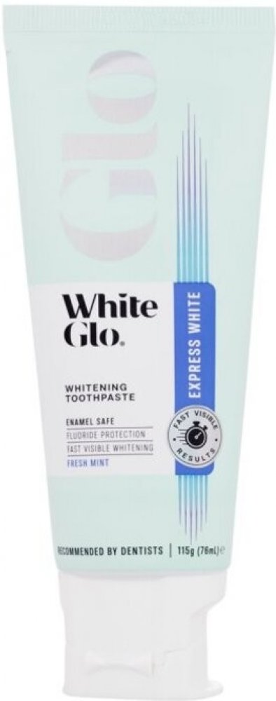 White Glo Glo Express White Whitening Toothpaste. Dopřejte si viditelně bělejší úsměv! Inovativní zubní pasta White Glo Glo Express White Whitening Toothpaste obsahuje šetrné bělicí složky s rychlým působením a také ovocný olej Rosa Canina, který zubům a dásním poskytuje výživu, péči a ochranu s vitamínem C. Přípravek vyhovuje i lidem s citlivými zuby. Čím boduje tato zubní pasta White Glo? * rych