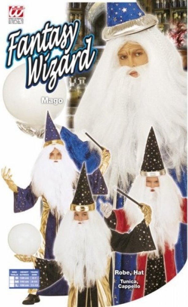 sametový kostým čaroděj pro děti ve velikosti 158 cm a 4 barevných variantách černý, červený, modrý a světle modrý. Kostým čaroděj obsahuje dlouhou róbu s rozšířenými rukávy a čarodějnický klobouk. Karnevalové kostýmy značky Widmann.