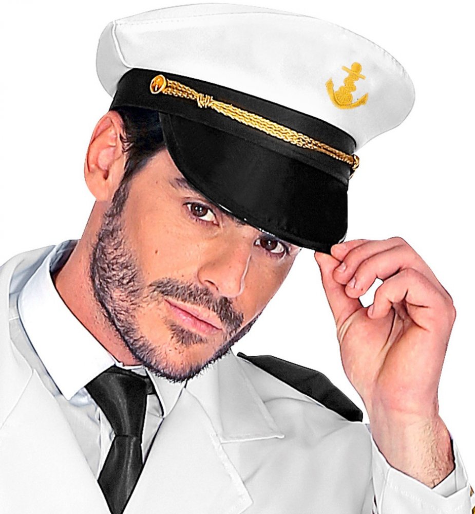 krásná karnevalová kapitánská čepice, vystužený přední díl nad kšiltem s kotvou a žlutou šňůrkou. Námořník od společnosti Widmann.