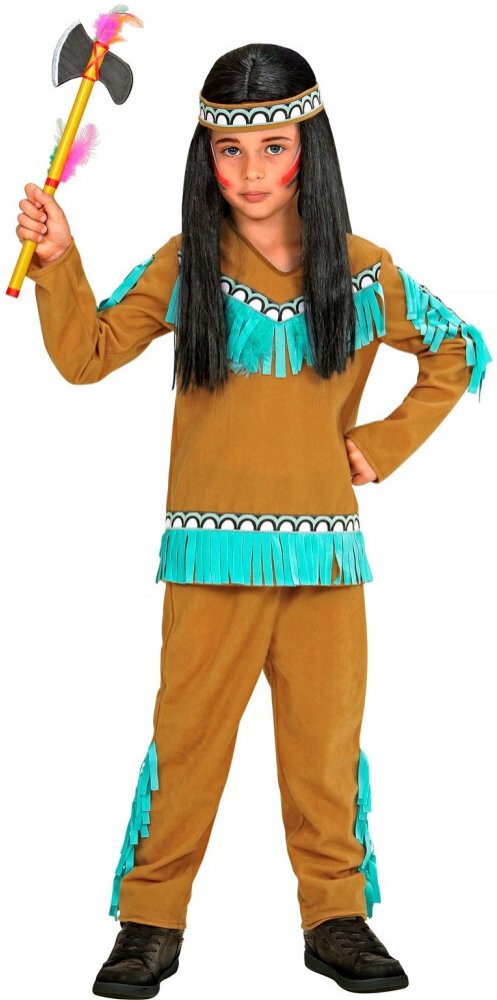Indiánská halenka, indiánské kalhoty a indiánská čelenka s pérem. Kostým indián v hnědé barvě zdobený světle modrými prvky. Indiánský tomahawk není součástí a můžete ho nakoupit zde.