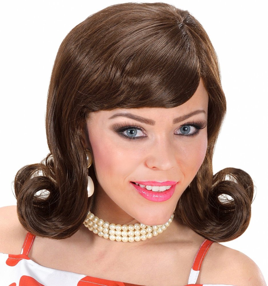 Dámská hnědá paruka s účesem typickým pro 60.léta. Doporučujeme dokoupit perlový náhrdelník z naší nabídky. Pro úpravu paruky lze použít malé množství laku na vlasy.
