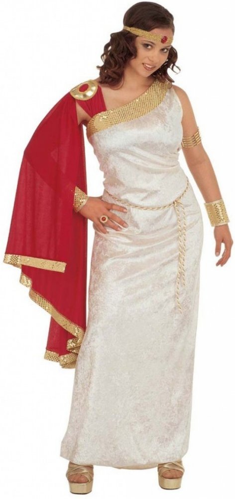 Kostým římské dámy obsahuje tuniku s tógou, pásek, náramky, čelenku s drahokamem