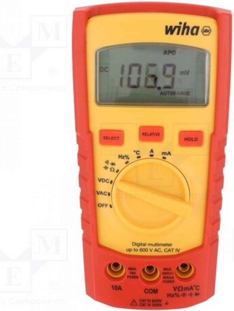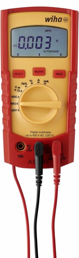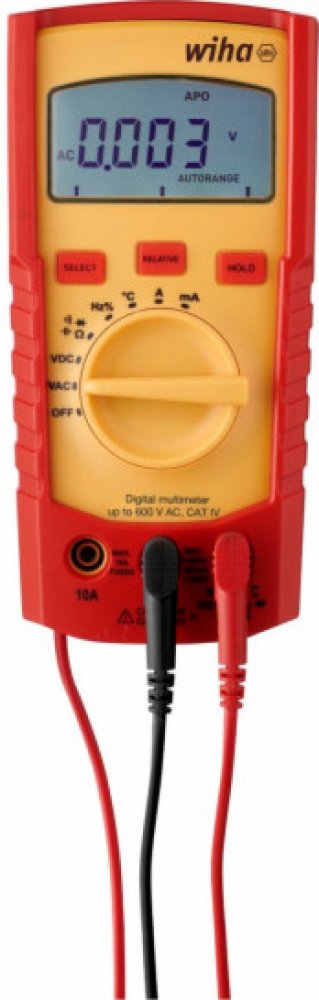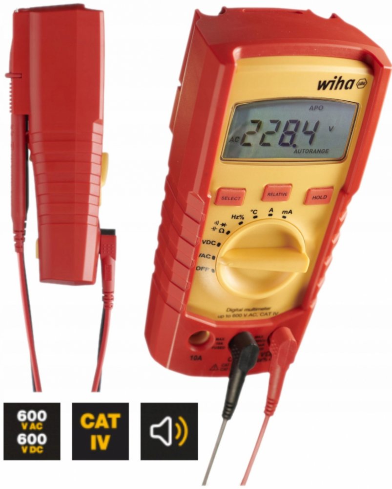 Popis produktu: Hledáte multimetr, který pokrývá důležité měřené veličiny používané v každodenní praxi elektromechanika? S digitálním multimetrem Wiha budete optimálně připraveni na nejrůznější měření. Nástroj umožňuje měřit napětí, proud, odpor, frekvenci, kapacitu i teplotu. Kromě toho dokáže také zkoušet průchodnost a diody. Výsledky měření lze neprodleně a v průběhu celého měření odečítat na velkém LCD displeji s funkcí Data Hold. Tok proudu při zkoušení průchodnosti signalizuje také akustický signál. Díky automatické volbě rozsahu měření odpadá nutnost ruční předvolby specifických rozsahů. Další předností je měření relativní hodnoty. Z ukládání předchozích výsledků měření a jejich porovnávání s budoucími výsledky vyplývá široká škála možností kontroly. V souladu s kategoriemi měření CAT III do 600 V a CAT IV do 300 V nabízí digitální multimetr Wiha maximální bezpečnost při práci v oblasti domovních instalací i přímo na zdrojích nízkonapěťové elektroinstalace. Rozměry: 150 × 80 × 45 mm Kategorie měření: CAT III do 600 V, CAT IV do 300 V. Standard: EN 61010-1, EN 61010-2-033, EN 61010-031. IP 40. Certifikace CE a GS. Použití: K víceúčelovému použití na různých místech.