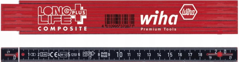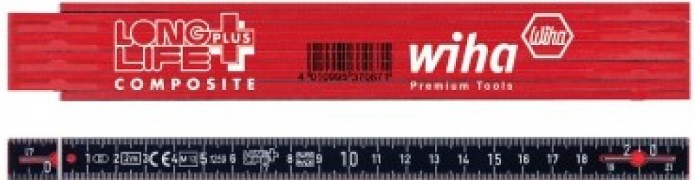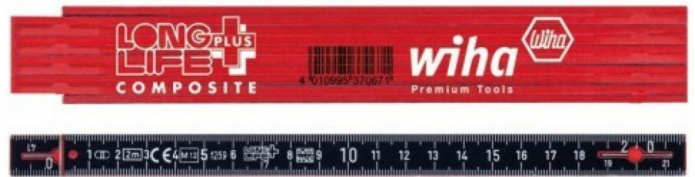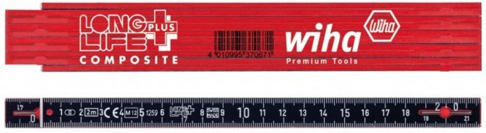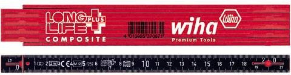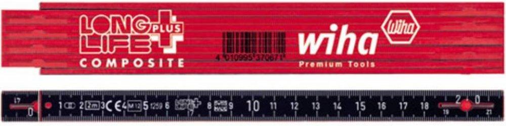 Provedení: Materiál: Kompozitní konstrukce: dvě krycí vrstvy z podélně orientovaných skelných vláken absorbují ohybové síly a zajišťují vyšší tuhost než je tomu u dřevěných metrů. Nehrozí žádné bobtnání při styku s vodou, je odolný vůči chemikáliím Přesnost: Shoda s CE, třída přesnosti II podle normy ES Kloub: Kloub s pružným elementem bez vůle, odolný proti opotřebení a proti znečištění, pro rovnoměrné vysoké napnutí. Tuhá aretace každého kloubu v poloze 90° a 180° Rozteč: Verze červená/černá: Hluboce vyryté bílé dělení po krocích 1 mm, bíle vyryté číslice desítek. Verze šedá/bílá: Hluboce vyryté černé dělení po krocích 1 mm, červeně vyryté číslice desítek Extra: Kovové koncovky u prvního a posledního článku zajištěné proti ztrátě. Oboustranné čtení díky pozpátku běžící stupnici (recto verso). Rozměry: šířka článků: 15mm barva: červená/černá hmotnost: 124g