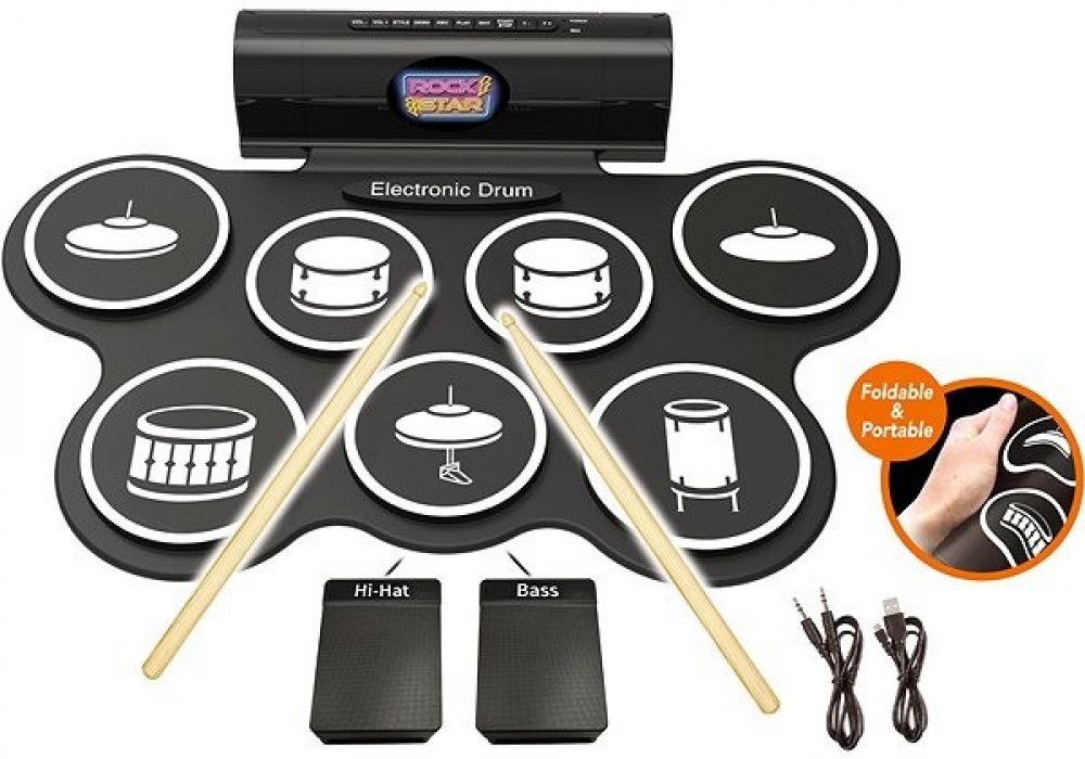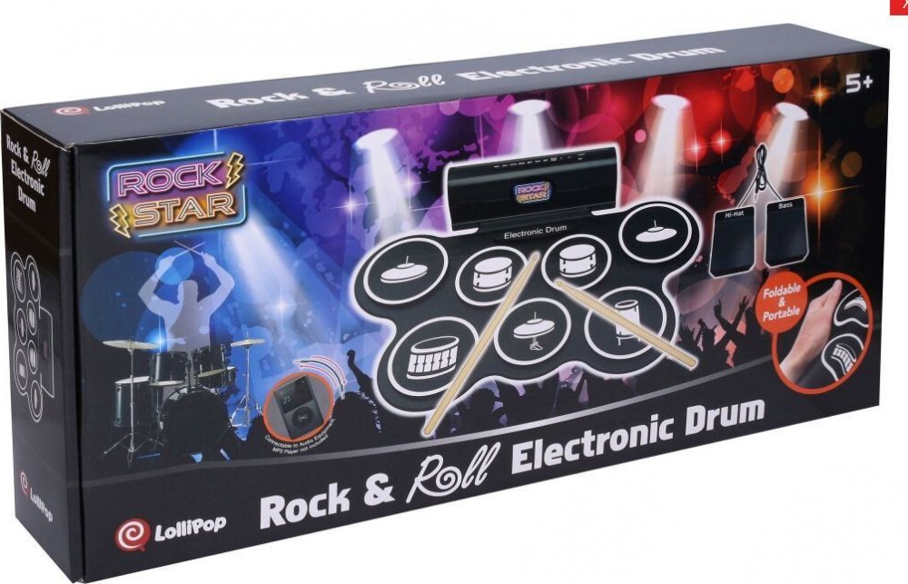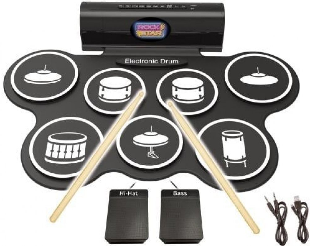 Elektronická bicí souprava s 2 pedály. Rozměry 44x32x6 cm. Světelné a zvukové efekty. 3xAA baterie součástí. Obsahuje 7 elektronických bubnů, 2 chodidlové pedály (hit-hat, bass), 2 dřevěné paličky, kabel na připojení mobilu/mp3 přehrávače, USB kabel, návod. Funkce - 7 realistických zvuků bubnů (pop, rock, latin, electro, percussion), 12 demo skladeb (funk, latin, dance, samba, cha-cha, swing hi-hat, upbeat rock, heavy rock), 9 rytmů, nahrávání (až 1000 úderů) a přehrávání, nastavení tempa a hlasitosti, konektor na připojení mobilu/mp3 přehrávače.