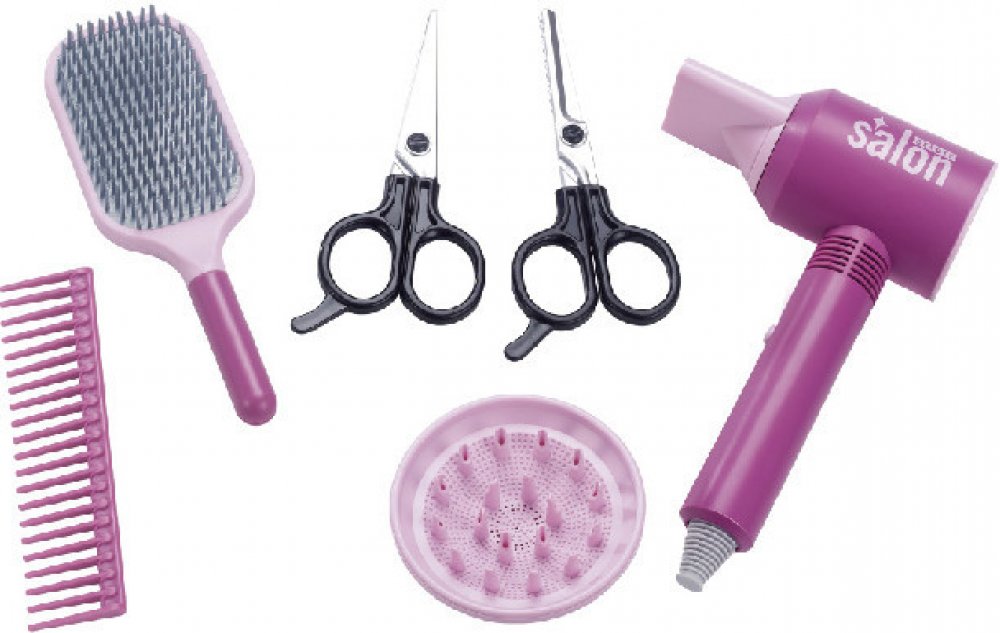 Kadeřnický set. Velikost fénu 21 cm. Fén na baterie. 3xAAA baterie nejsou součástí. Přepínač na fénu - vypnuto, pomalé, rychlé vysoušení. Obsahuje fén s nástavcem, hřeben, kartáč, standardní nůžky, efilační nůžky.