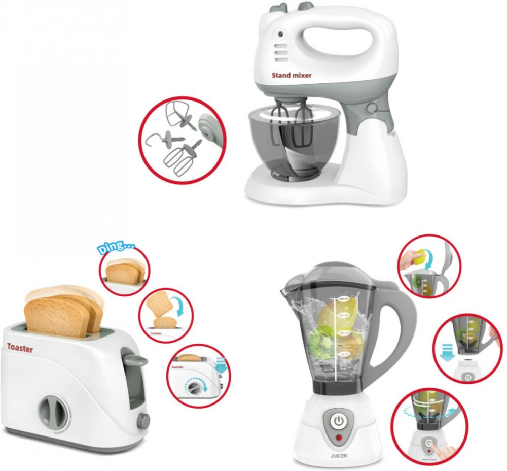 Kuchyňské spotřebiče set s efekty. Mixér s ovocem: on/off přepínač baterie 2xAA nejsou součástí, rozměry: 11x14x23cm, světelné efekty. návod na použití na obale. Nádoba je odnímatelná.Toustovač: rozměry 17x9.2x16cm. Páčkou vpravo se tousty zasunou dovnitř. Nastavením kolečka vepředu začne běžet časovač. Po vypršení času tousty vyskočí.Šlehač: rozměry 20,5x9,6x18cm on/off vypínač, 3náhradní metly, ...