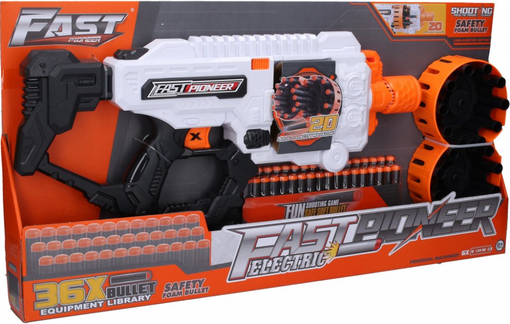Zažijte akci s tímto parádním kulometem, který obsahuje 36 pěnových nábojů a dva zásobníky. Kompaktní design o rozměru 52 cm je ideální pro vnitřní i venkovní hraní.Tento kulomet je fantastickou volbou pro milovníky akčních her. Pěnové náboje zajišťují bezpečnou zábavu a dva zásobníky umožňují rychlé přebíjení, každý na 10 nábojů. Díky ergonomickému designu o rozměrech 52x20x23 cm se skvěle hodí pro všechny věkové kategorie. Pro používání kulometu budete potřebovat 6xAA baterie, které nejsou součástí balení. Pucka na uvolnění zásobníku je snadno dostupná díky oranžovému tlačítku, takže můžete rychle vyměnit zásobníky během her. Návod na použití je jasně ilustrován na zadní straně obalu, což usnadňuje rychlé zvládnutí funkcí kulometu i pro nováčky.SpecifikacePočet pěnových nábojů36Rozměry52x20x23 cmBaterie6xAA (nejsou součástí)Počet zásobníků2 (každý na 10 nábojů)Uvolnění zásobníkuOranžové tlačítko