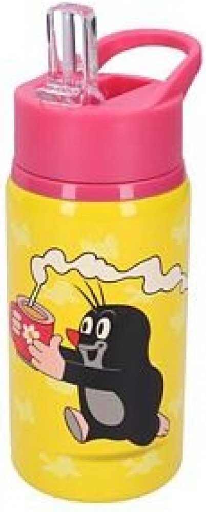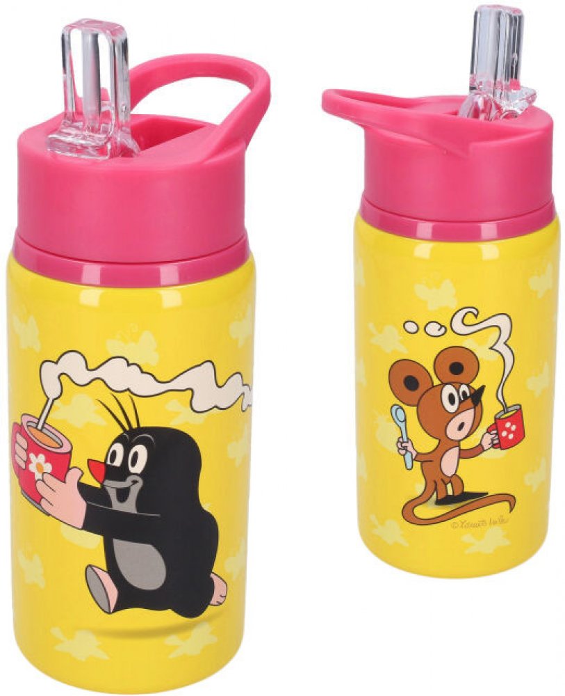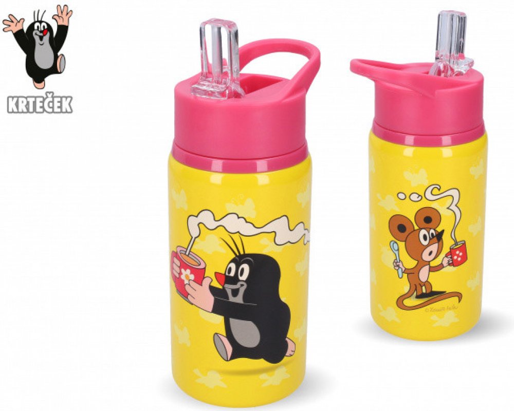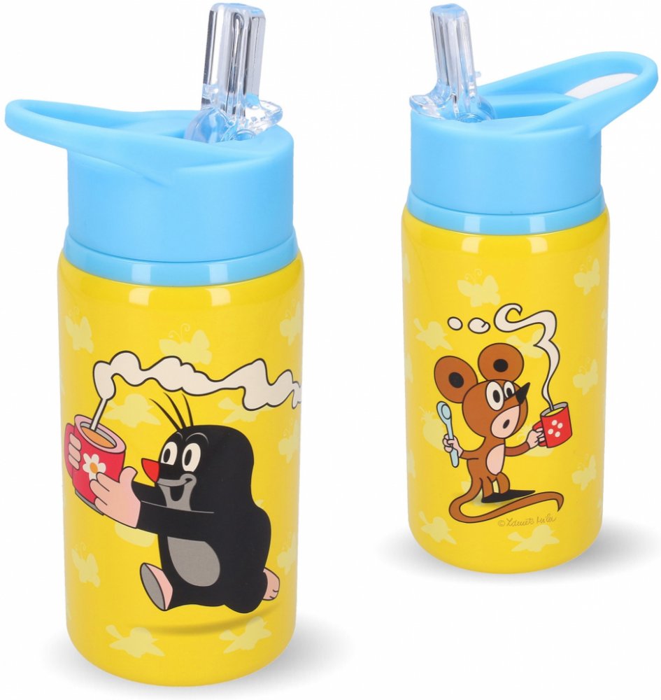 Žlutá kovová láhev na pití s modrým plastovým vrškem, s motivem Krtečka a myšky, pro všechny chlapečky, kteří milují Krtečka.