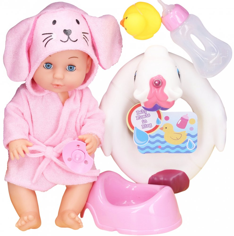 Miminko s kruhem.Velikost 27cm.Obsahuje miminko, župan, dudlík, nočník, kruh pro miminko, lahvičku, kačenku