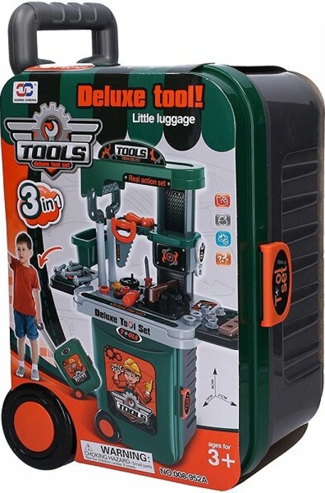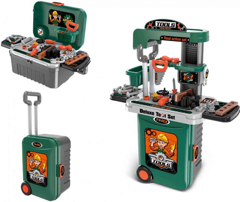 Nářadí stolek kufřík set. Velikost 38cm. Kufřík je na kolečkách a má vysunovací madlo. Výška s vysunutým madlem 55,5cm, výška se zasunutým madlem 38cm. Kufřík jde přestavět na kutilský stolek o rozměrech: 66x50x21cm. Návod na sestavení na obale. Obsahuje nářadí, šroubky, ozubená kola, svěrák a další příslušenství.