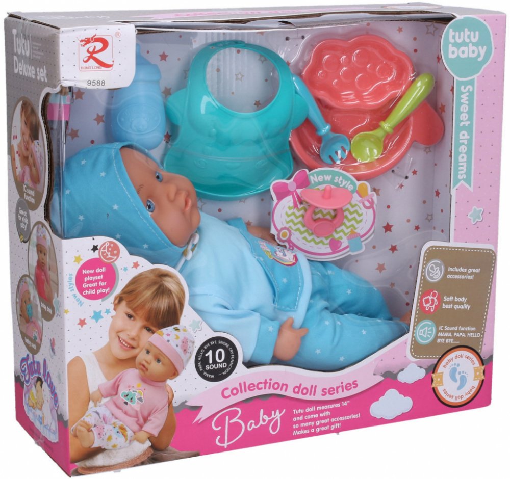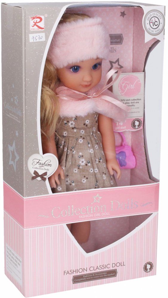 \nPanenka s kožíškem. Velikost 35cm. Zvukové efekty. obsahuje: panenku, kabelku, hřeben. 3xAG13 baterie součástí.\n