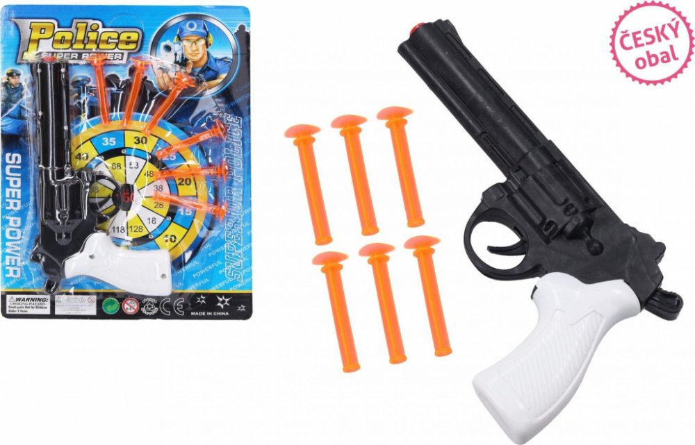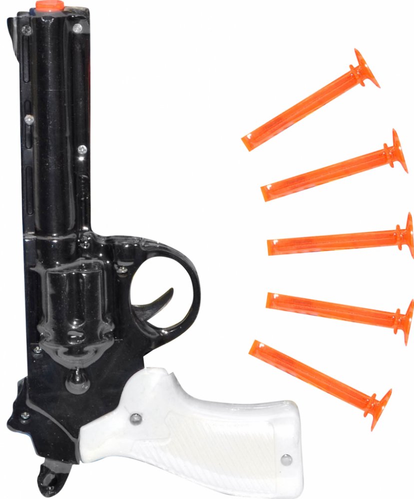 Pistole na přísavky pro malé bojovníky nebo pistolníky. Dětem se při hře s pistolkou a náboji nemůže nic stát, protože náboje jsou opatřeny přísavkami. Děti mohou střílet do terče, nebo i na sklo. Pistol je vyrobena z vysoce kvalitního a zdravotně nezávadného plastu, který je odolný vůči mechanickému poškození.