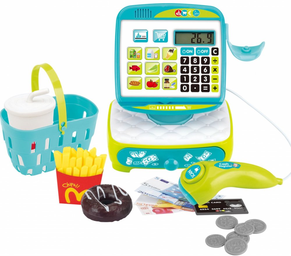 Nákupy mohou být zábava!S realistickými funkcemi a praktickým designem je ideální pro hodiny kreativního hraní.Obsahuje pokladnu, košík s potravinami, peníze a kreditní kartu.Pokladna funguje jako kalkulačka. Má vysunovací šuplík na peníze.Světlené a zvukové efekty. 2xAA baterie nejsou součástí.