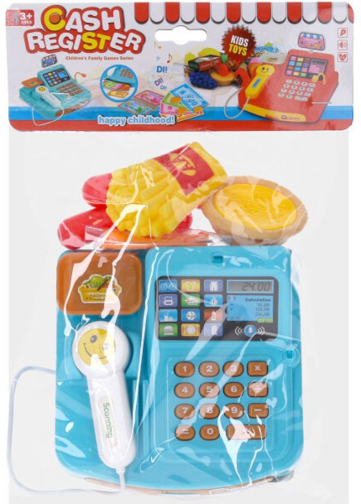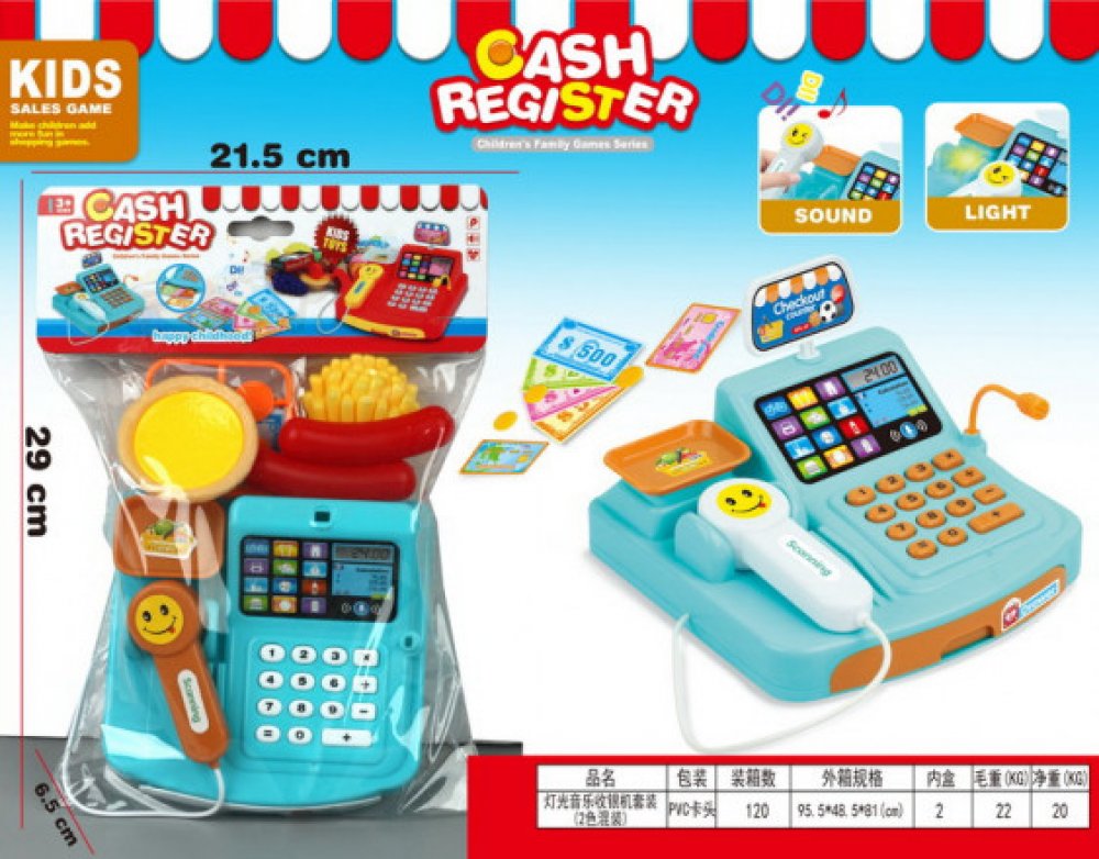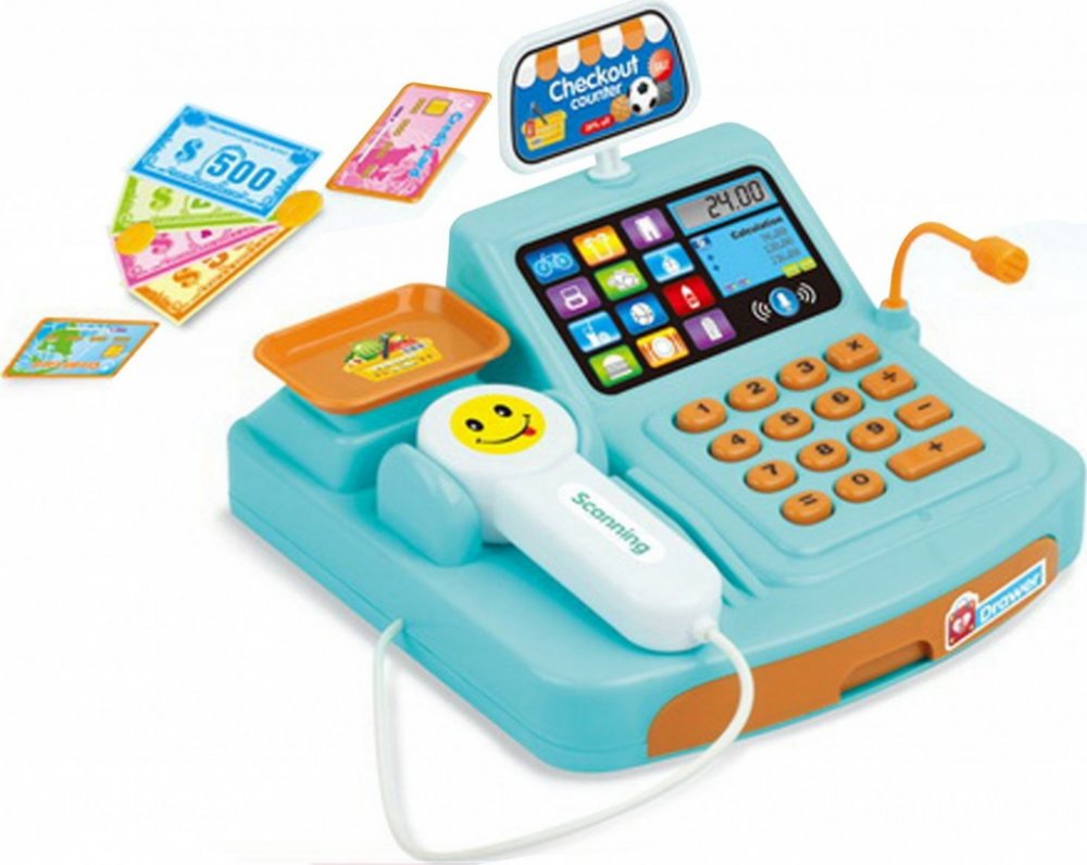 Pokladna s doplňky. Rozměry 15x15x6,5 cm. Světelné a zvukové efekty. 2xAA baterie. Obsah balení - pokladna, potraviny, peníze.