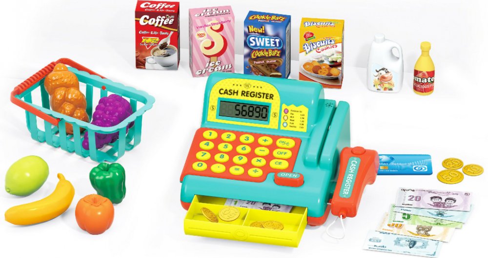 Pokladna s efekty. Velikost 20 cm. 2xAA baterie, nejsou součástí. Čtečka kódů vydává světelné a zvukové efekty. Balení obsahuje i papírové bankovky.