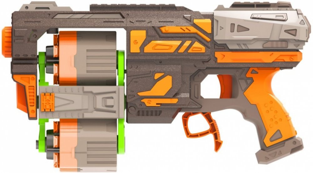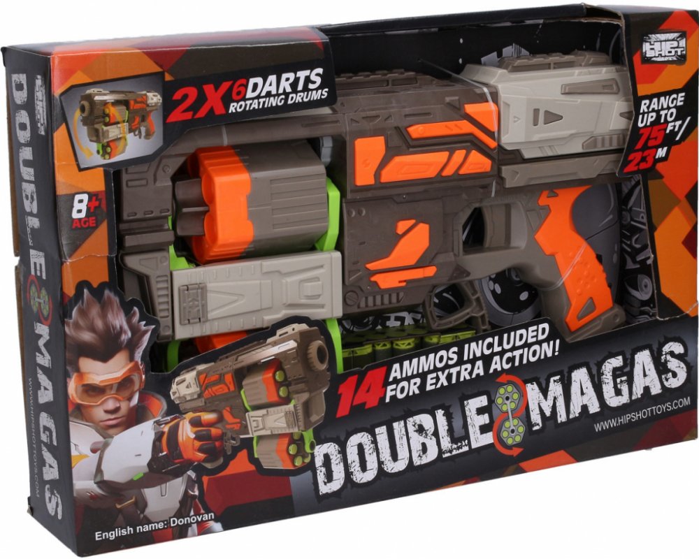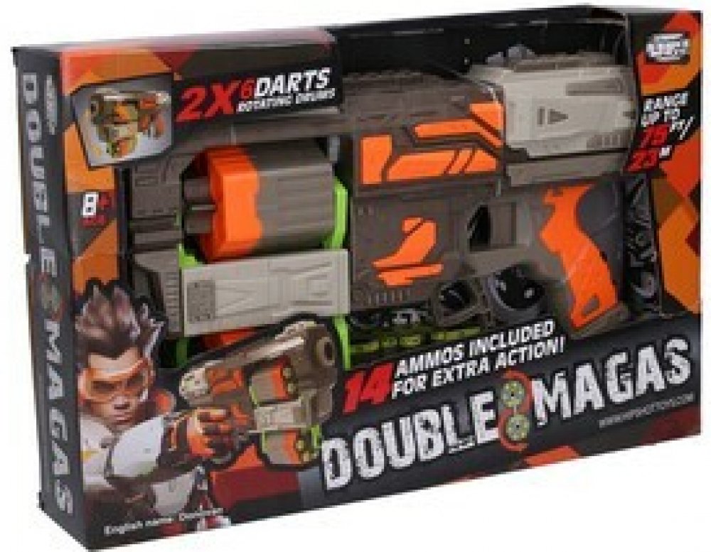 Puška se 14 pěnovými náboji. Rozměry 33,5x7x18,5 cm. 2 zásobníky, každý na 6 nábojů. Zásobník lze vyjmout. Páka pod kohoutkem - prohození zásobníků. Nabíjení natáhnutím zadní části zbraně. Dostřel 23 m. Obrázkový návod s popisem na zadní straně obalu.