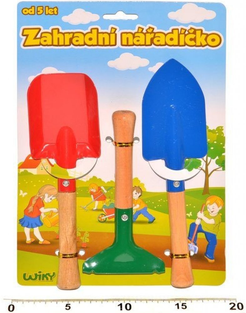 Dětské pracovní nářadí kov/dřevo, pro všechny malé zahradníky, kteří chtějí pomáhat svým rodičům s pracemi na zahrádce. Lopatka (20,5 cm), rýč (21,5 cm), hrábě (16 cm). Baleno na kartě. Rozměry balení 19 x 28 x 3 cm. Vhodné pro děti od 5 let.