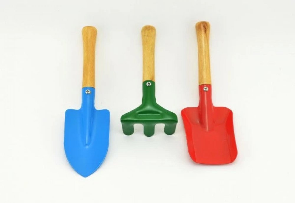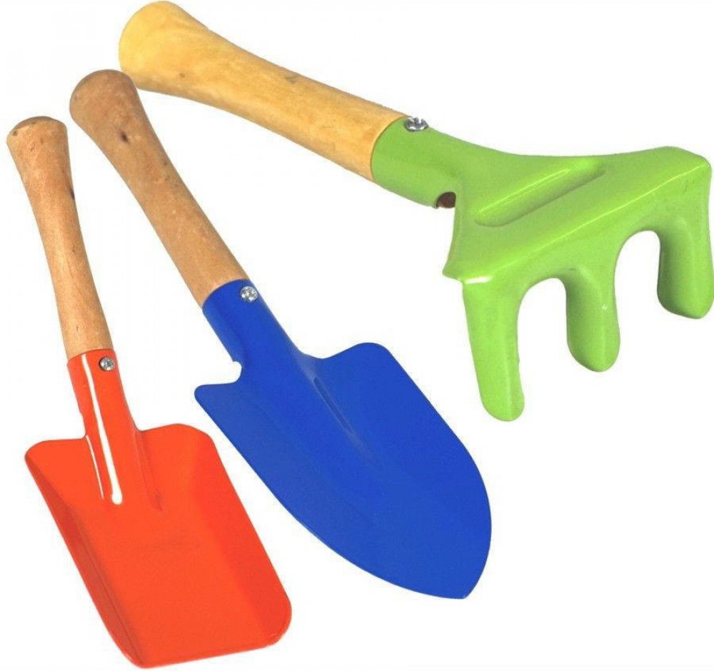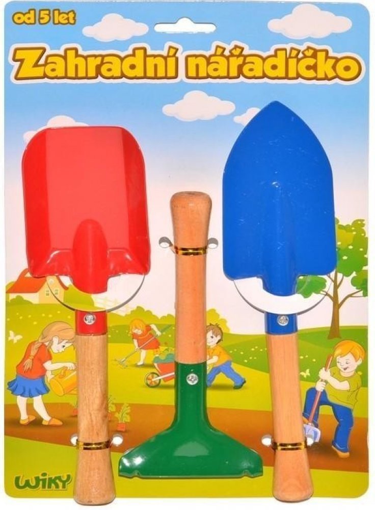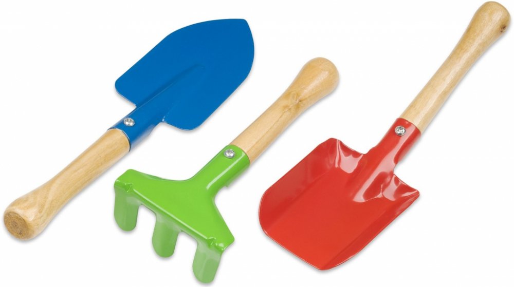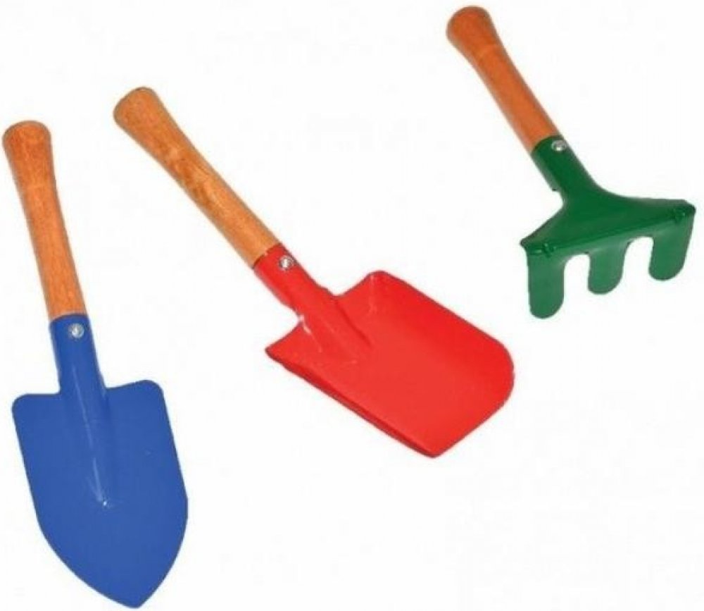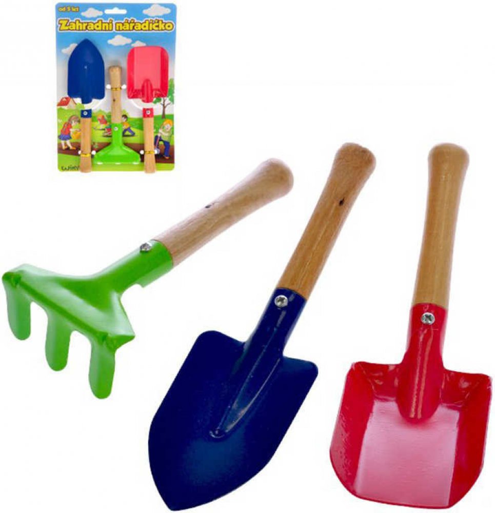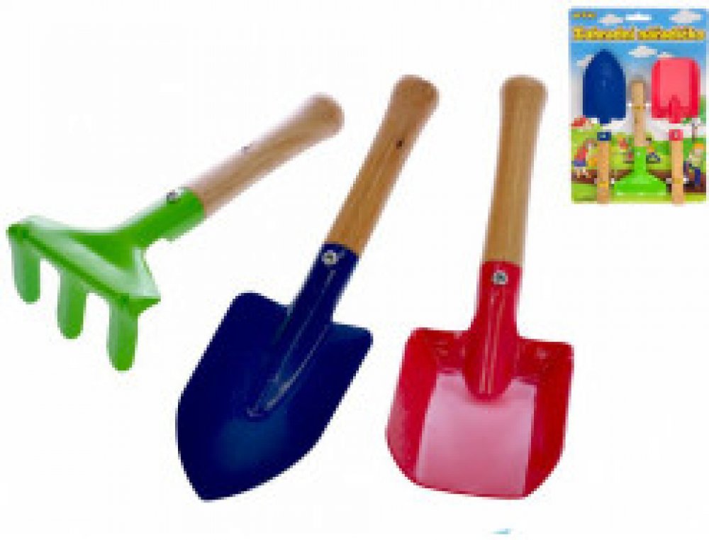 Krásné hrabičky nebo lopatka na písek jsou vyrobeny v pestrých barvách. Tělo je z kovu a rukojeť je dřevěná. S tímto nářadím mohou děti pomáhat svým rodičům při pracích na zahradě nebo si hrát na písku. Sada obsahuje: motyka hrábě lopata