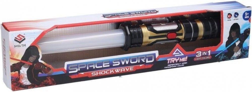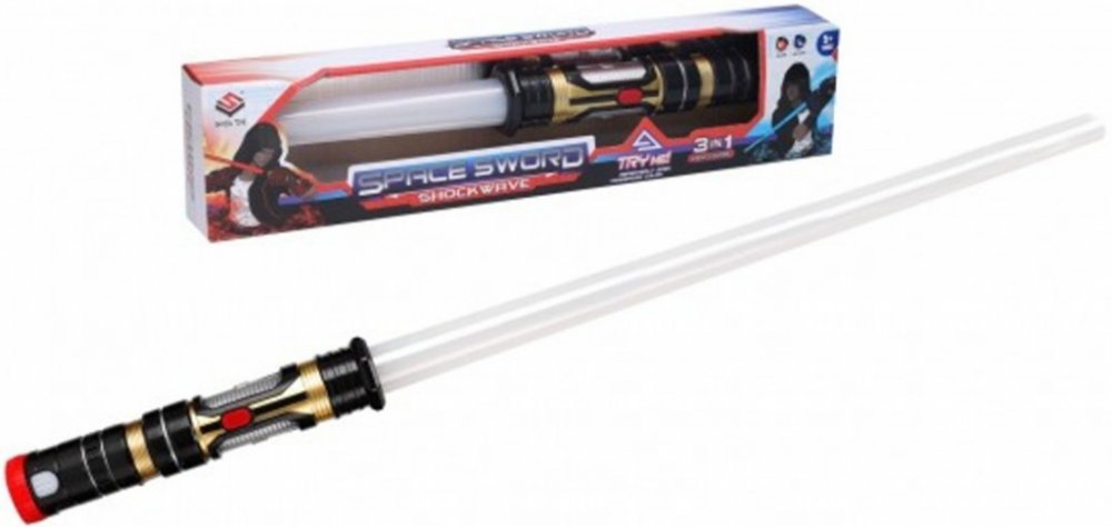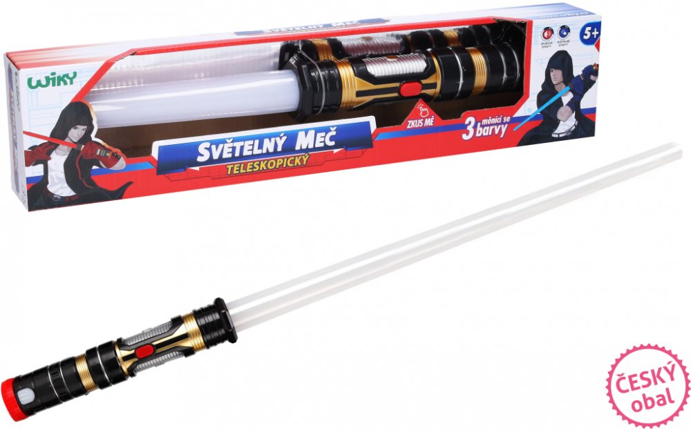 Světelný meč, který nesmí chybět žádnému malému bojovníkovi z vesmíru nebo fanouškovi Star Wars. Velikost složený 43 cm, vysunutý 80 cm. Mění barvu (červená, modrá, fialová). Světelné a zvukové efekty. 3x AAA baterie součástí.Rozměry balení 47 x 10 x 6 cm.Vhodné pro děti od 5 let. Vyzbroj se světelným teleskopickým mečem a bojuj proti zlu. Tento pomocník tě bude doprovázet na všech dobrodružných výpravách. Překvap svého nepřítele v boji s originálním svítícím mečem! Meč mění barvu (červená, modrá, fialová). Velikost: 43/80 cm. Doporučený věk: od 3 let 3xAAA baterie jsou součástí. Světelný meč teleskopický. Velikost složený 43 cm, rozložený 80 cm. Mění barvu (červená, modrá, fialová). Světelné a zvukové efekty. 3xAAA baterie součástí.