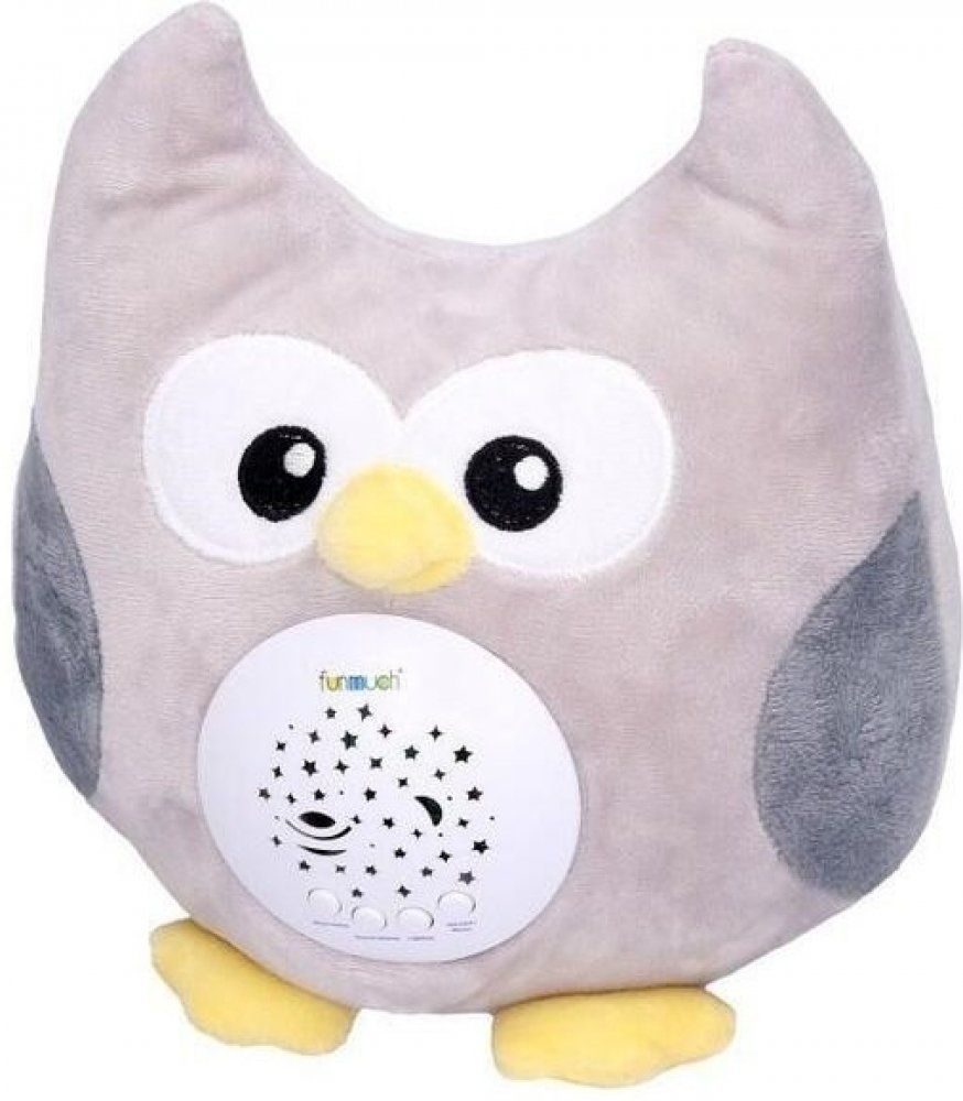 Usínáček. Plyšová sovička, světelná projekce - hvězdičky, střídání barev, hudba, bílý šum.