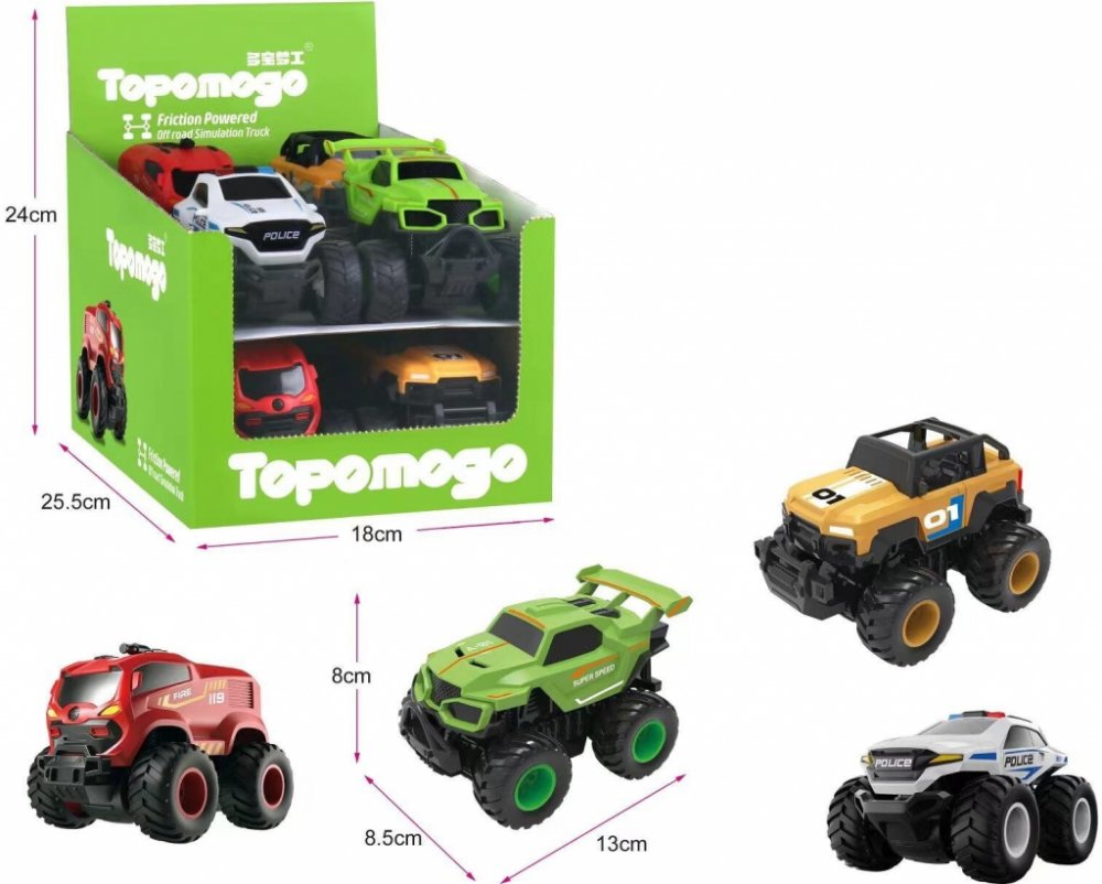 Vydejte se za dobrodružstvím s autem Big Foot o velikosti 13 cm. Tento model na setrvačník je k dispozici ve čtyřech variantách: hasiči, policie, zelené a žluté.Připravte se na zábavu se čtyřmi různými designy našeho auta Big Foot. Každé auto měří 13 cm na délku, takže je ideální nejen pro vnitřní, ale i venkovní hraní.Vlastnosti:Čtyři varianty: hasiči, policie, zelené a žlutéSetrvačník: snadná a jednoduchá jízdaVelikost: kompaktní rozměry 13x8,5x8 cmPřizpůsoben pro děti i dospěléSpecifikaceRozměry13x8,5x8 cmSystém pohonuSetrvačníkVariantyHasiči, Policie, Zelené, ŽlutéBalení8 ks display box