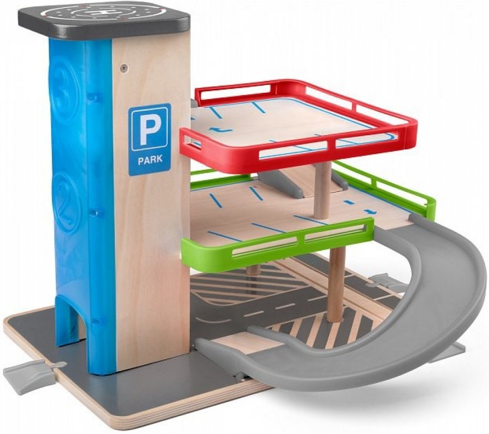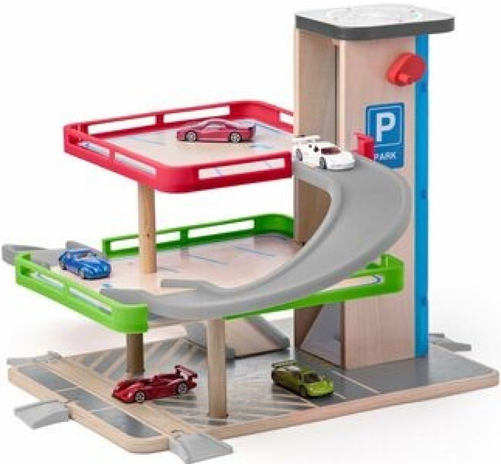 Dřevěná garáž s výtahem je skvělá zábava pro malé motoristy. Jednoduše zajeďte se svým autíčkem do výtahu, nechte se vyvézt do nejvyššího patra a zaparkujte nebo si sjeďte o patro níže. Garáž má tři úrovně nastavitelnosti výtahu. Výtah lze jednoduše mechanicky posouvat nahoru a dolů díky otočnému kolečku.