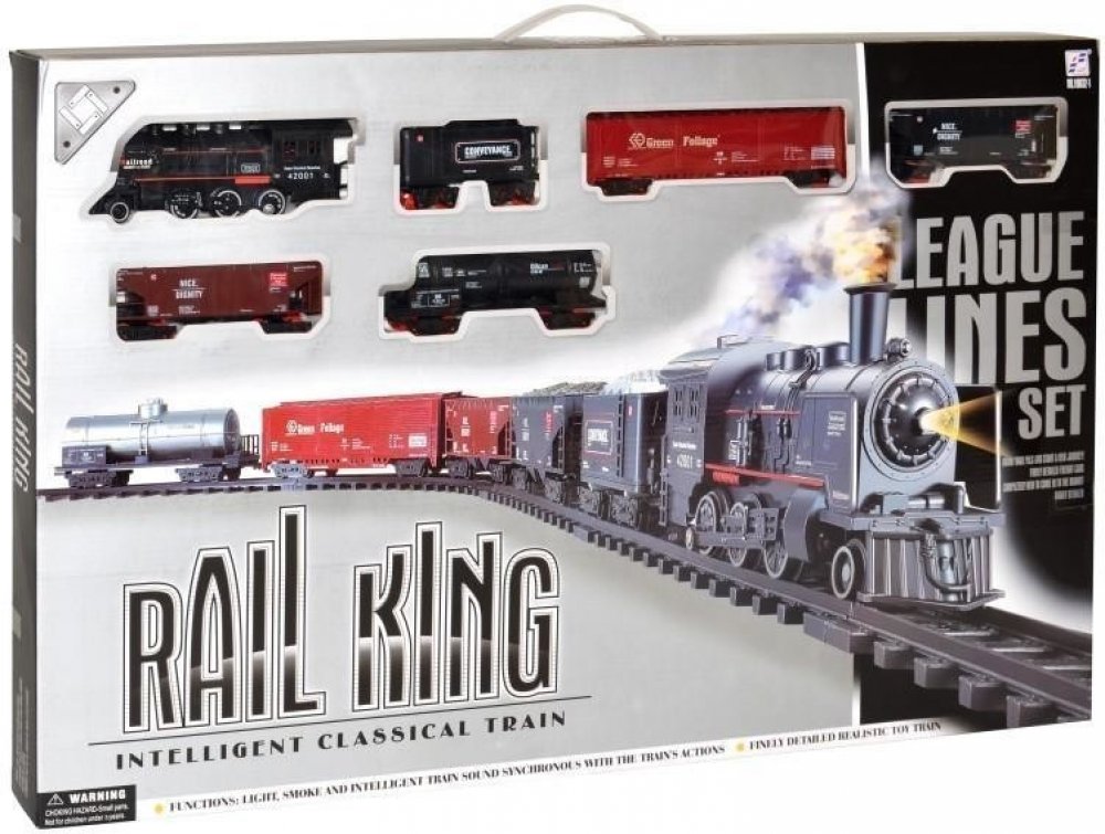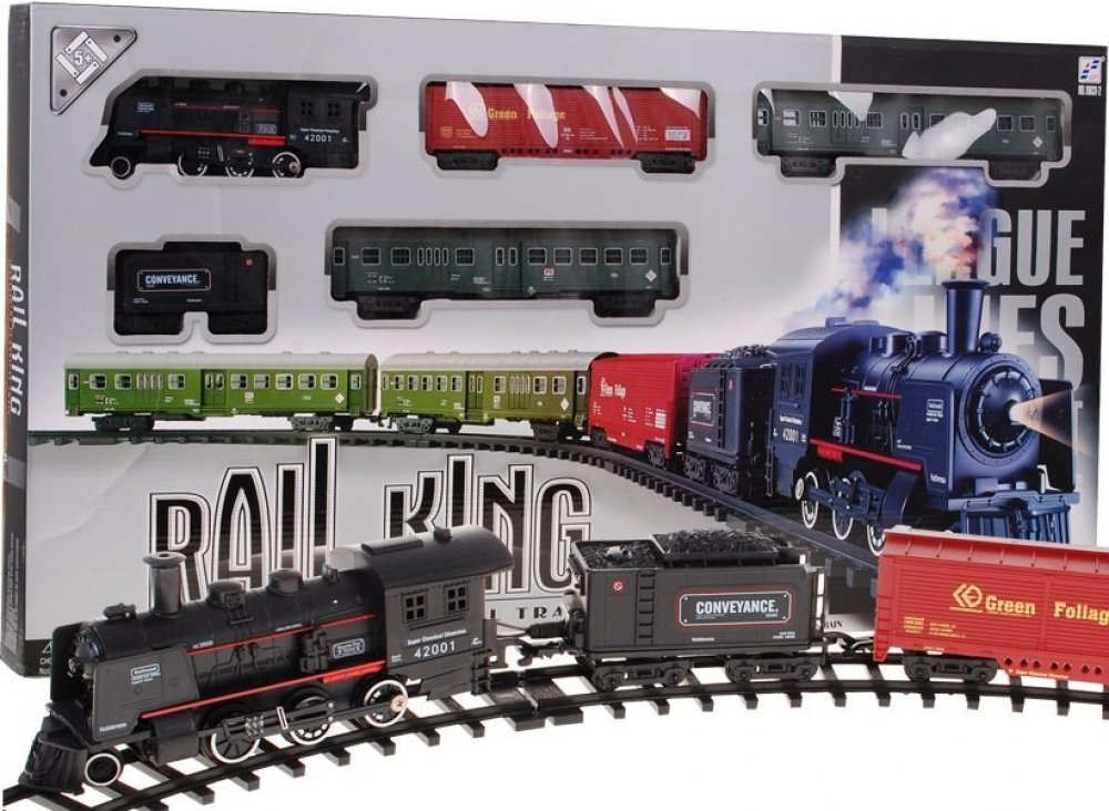 Bateriový vláček Rail King s dýmem - Perfektní hračka pro malé vláčkomanie! Tento vláček s dýmem jistě potěší každého malého i velkého milovníka vláčků. Postavte si svou vlastní železnici v pokoji a nechte svého malého strojvůdce řídit vlak, který se mu jistě nebude chtít pustit. Celková délka kolejiště je 156 cm x 78 cm a má elipsovitý tvar pro zajímavé trasy. V balení najdete kompletní sadu kolejí, různé vagónky, lokomotivu a doplňky. Tento vláček vydává autentické zvuky, které připomínají skutečný vlak. Skvělý dárek pro malé strojvůdce od 5 let. Hračka je certifikována CE a je zabalená v pěkné velké krabici, ideální jako dárek.