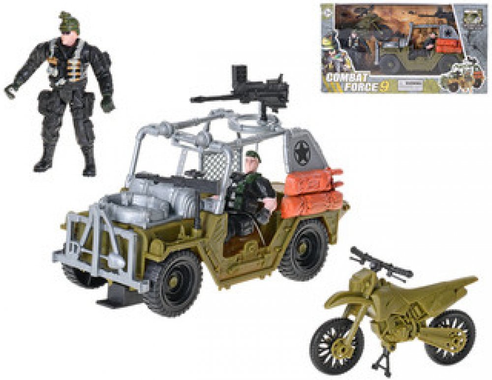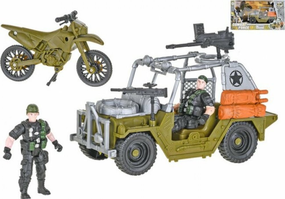 Vojenský set s jeepem - 21 cm. 2 varianty - černý, šedý. Čeká vás tajná vojenská operace, při které musíte nepozorovaně vstoupit do nepřátelské zóny! Dokážete to na motorce nebo s ozbrojeným terénním vozem? Velikost auta: 21 cm Doporučený věk: od 3 let