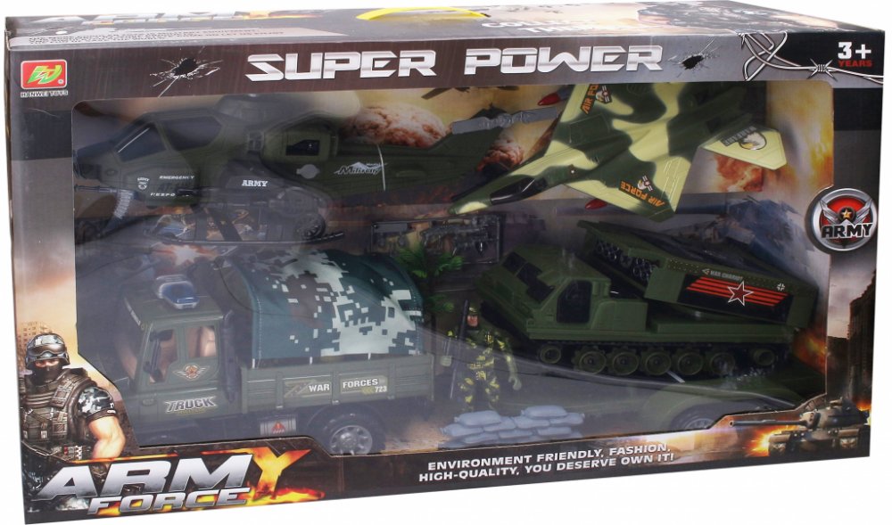 \nVojenské auto s přívěsem a vojákem. Velikost auta s přívěsem 63cm. Obsahuje auto, přívěs, raketomet, stíhačku, vrtulník, figurku vojáka, doplňky.\n