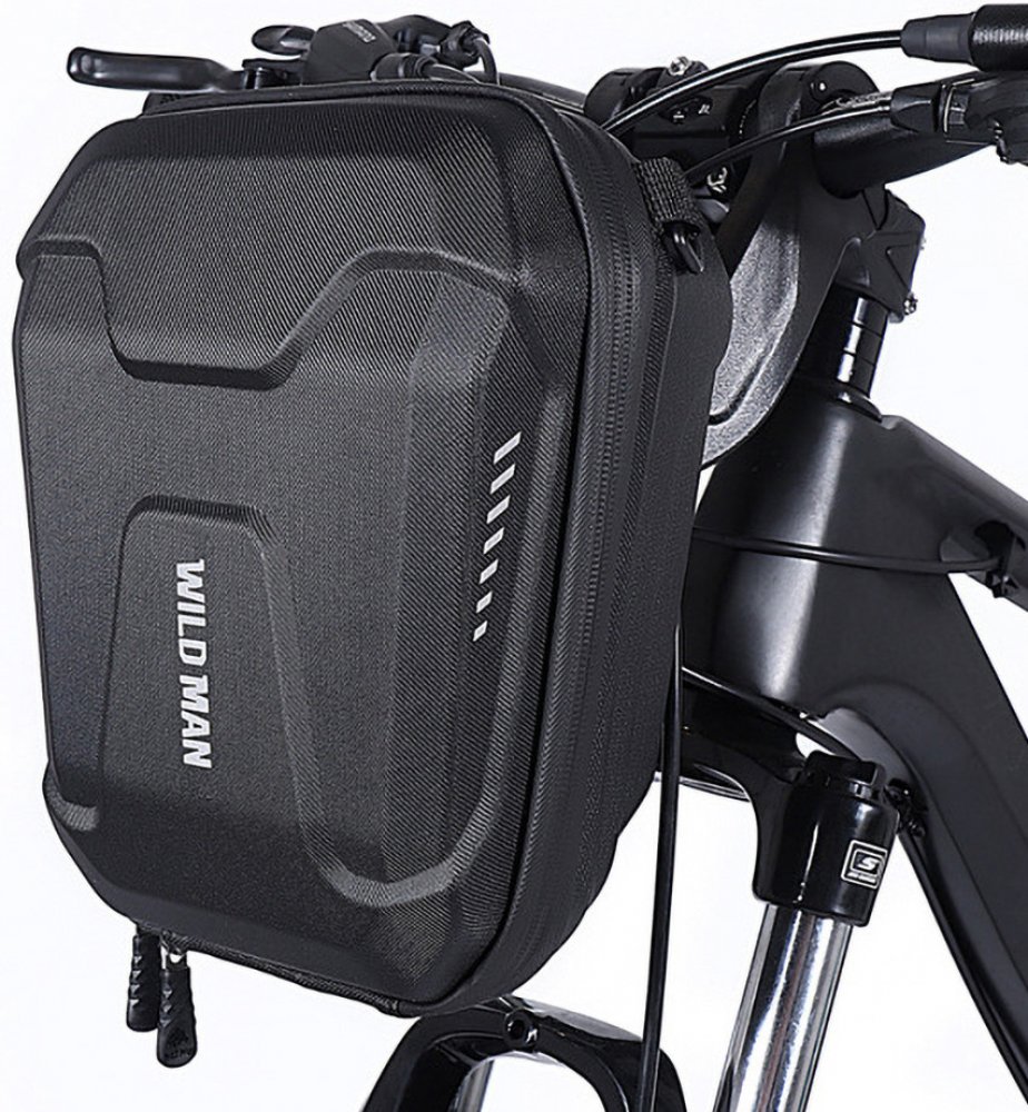 Brašna na kolo na řídítka s držákem na klick. Pevná cyklo brašna díky 3D tvarované kostře s EVA výplní lisované za studena. Taška na řídítka Wildman E8 je opatřena reflexivním logem a proužky po stranách. Kapsa na řídítka má zvýšenou voděodolnost díky vnější PU vrstvě a pogumovanému zipu. Brašna na řídítka je opatřena držákem s rychlým vysunutím pomocí tlačítka (obdoba klickfix). Součástí balení je řemínek a produkt může sloužit i jako taška přes rameno. Dostatečně velký 3l objem poskytuje prostor pro příslušenství kola nebo koloběžky. Uvnitř brašny je síťka pro pohodlnější a přehlednější uložení věcí. Vhodné jako brašna na řídítka pro silniční, trekové i horské kolo, brašnu využije i elektrická koloběžka. Nedoporučujeme brašnu používat pro jízdu skrz výrazný terén. Upevnění na řídítka o průměru 2-3cm, rozteč mezi upevňovacími klouby je 5 cm. Díky sníženému držáku brašny nepřekáží cyklistickému světlu. Rozměry brašny 25,5x18,5x12,5cm (viz. obrázek). Váha 562g.