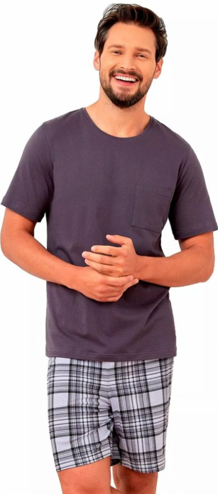 Pánské bavlněné pyžamo s krátkým rukávem a vzorovanými kraťasy. Jednobarevné tričko je s krátkým rukávem a malou kapsou na prsou. Vzorované kraťasy jsou šité bez kapes a mají volnou gumu v pase. Pyžamo je možné používat i jako běžné oblečení na doma.