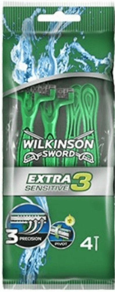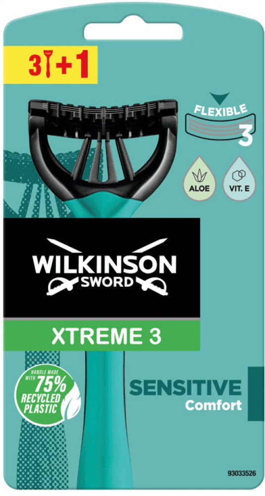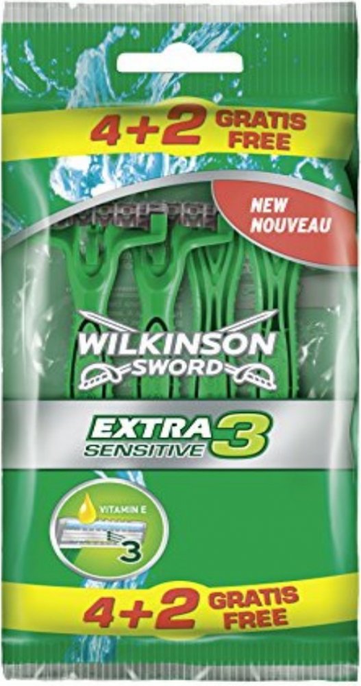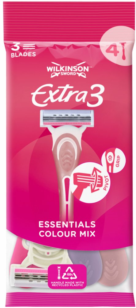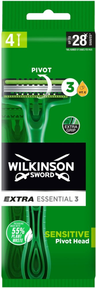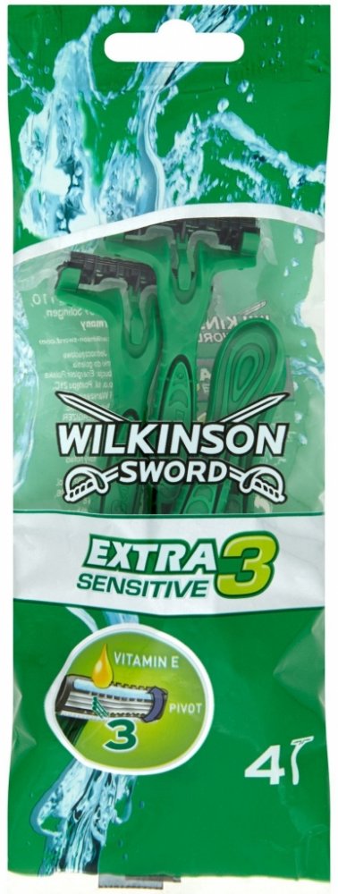 Wilkinson Extra3 se 3 břity na výkyvné hlavici zaručují důkladné holení. Zvlhčující proužek udržuje pokožku v dobré kondici. Proužek pro napínání pokožky usnadňuje důkladné oholení. Lehká, profilovaná, plastová rukojeť byla navržena tak, aby byl zaručen pohodlný úchop.