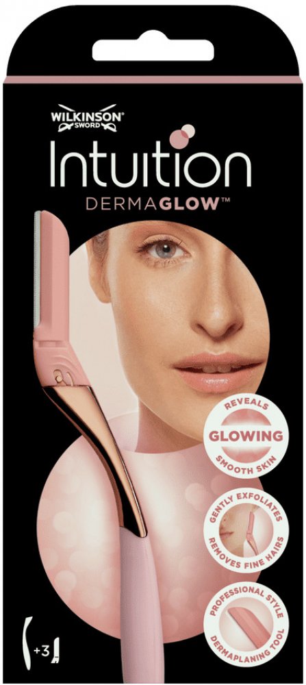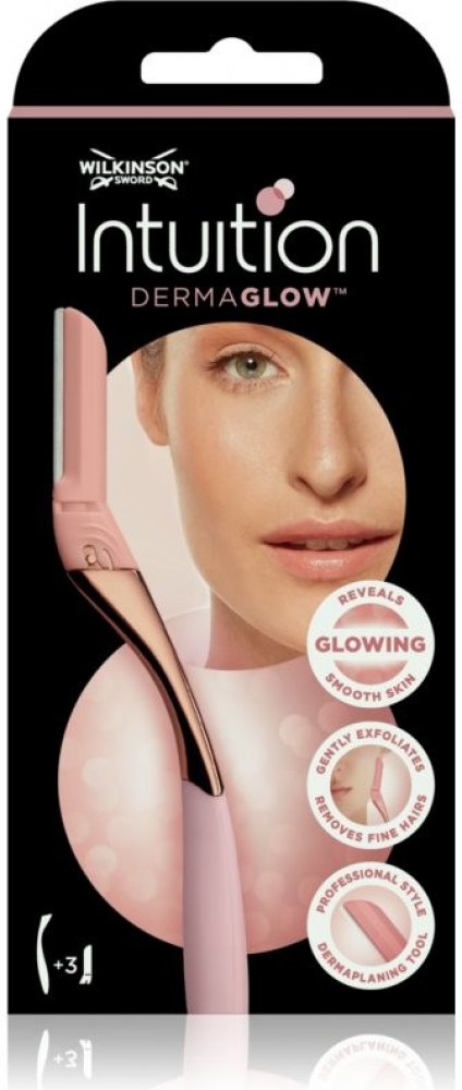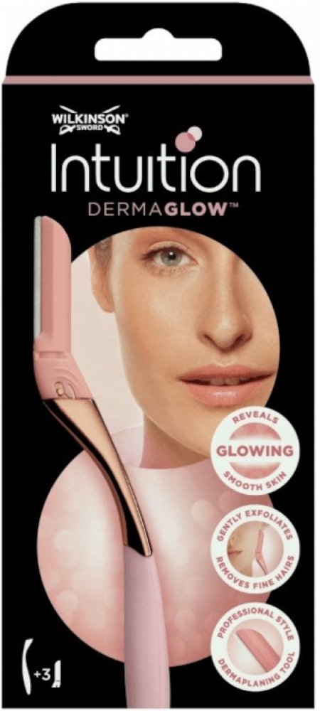 Dámský holicí strojek Wilkinson Intuition DermaGlow pro upravení obočí a ošetření pleti odstraněním jemných chloupků a odumřelé kůže. Žiletka je navržena tak, že její okraje s mikroochrannými kryty brání podráždění odlupováním pouze odumřelé kůže.