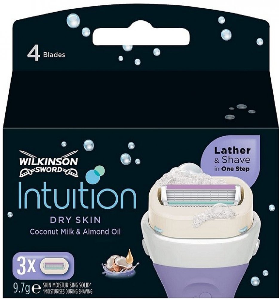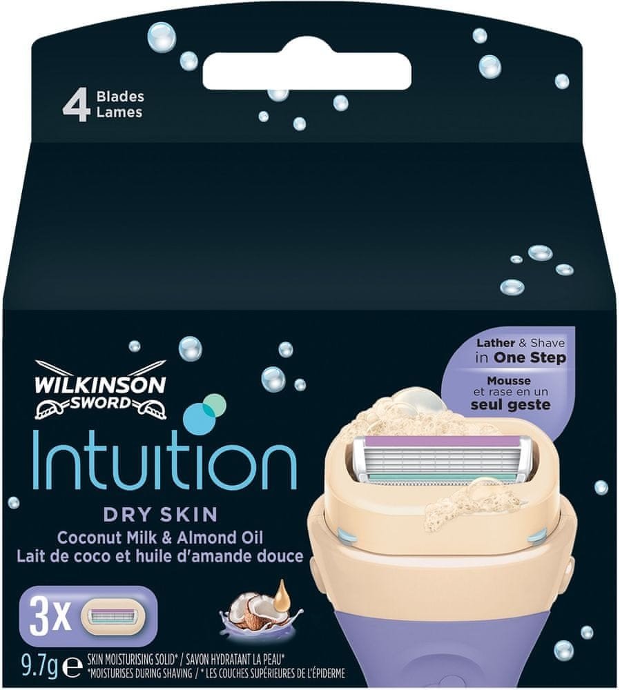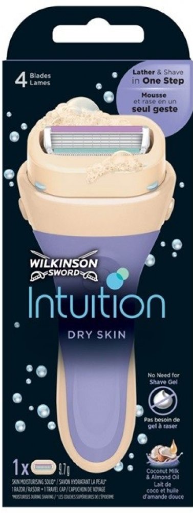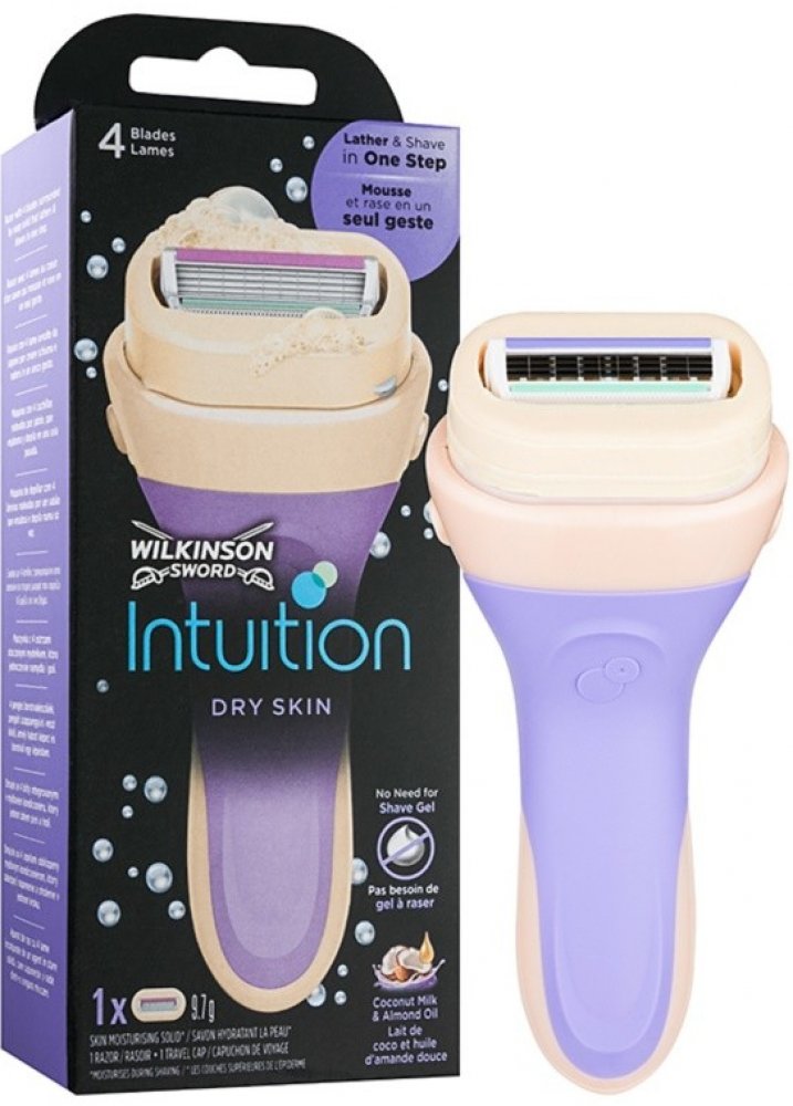 Dámský holicí strojek Wilkinson Sword Intuition Dry Skin se 4 břity integrovanými v mýdlovém kondicionéru, který jedním tahem pění a holí.