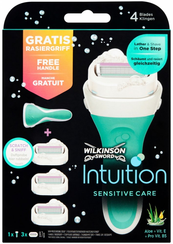 Díky speciálnímu kondicionéru na pokožku žiletky Wilkinson Intuition 2v1 Sensitive Care pění a holí zároveň – bez dalšího gelu na holení nebo pěny na holení. Holicí strojek se díky oscilační hlavici dokonale přizpůsobí konturám těla a zajistí obzvlášť hladké oholení. Břity jsou obklopeny kondicionérem pokožky, který při kontaktu s vodou pění. Je obzvláště šetrný a jemný, a to i na velmi citlivou pokožku.