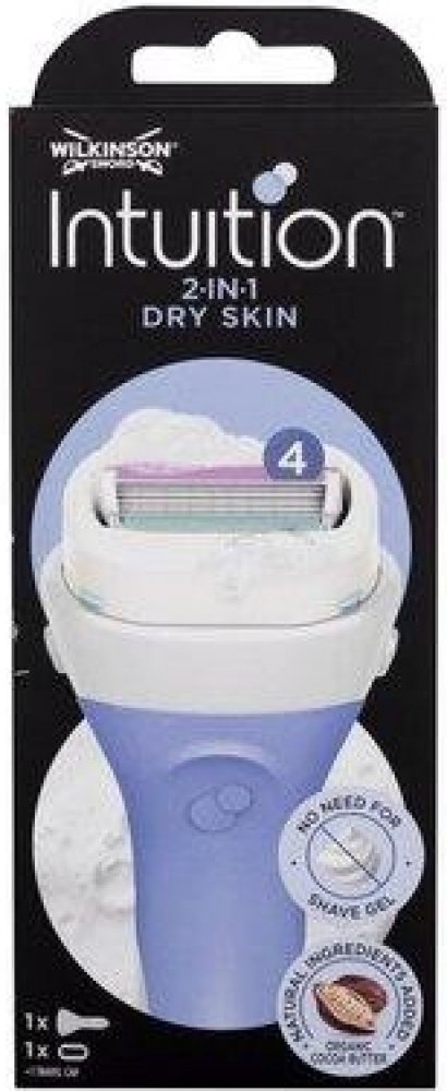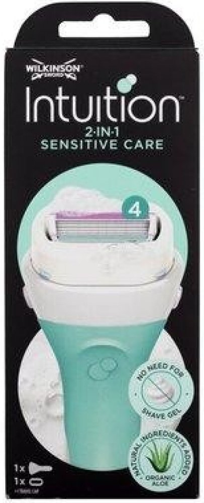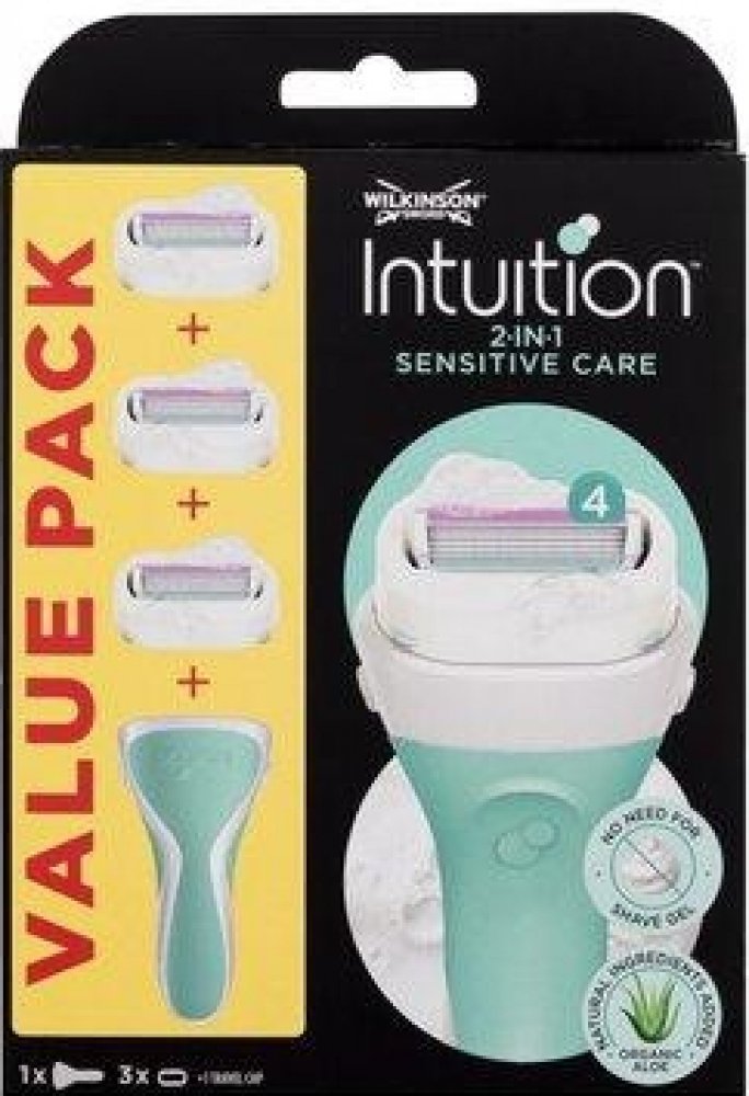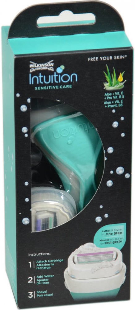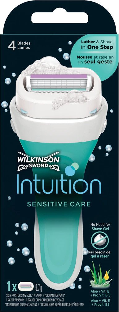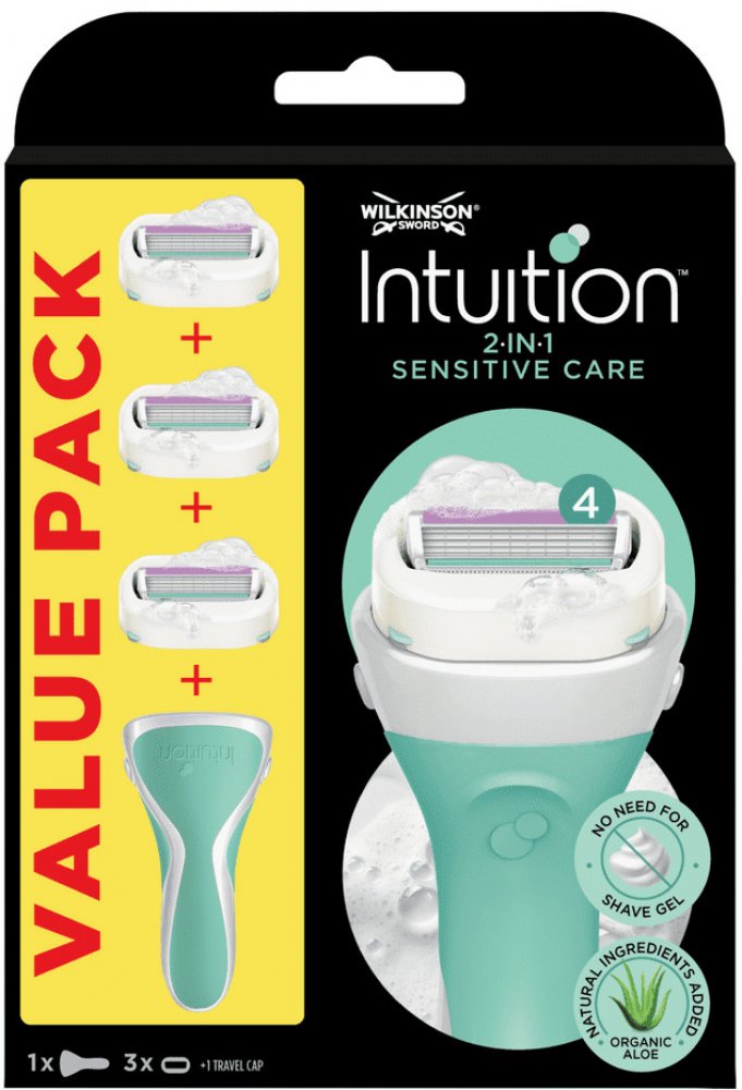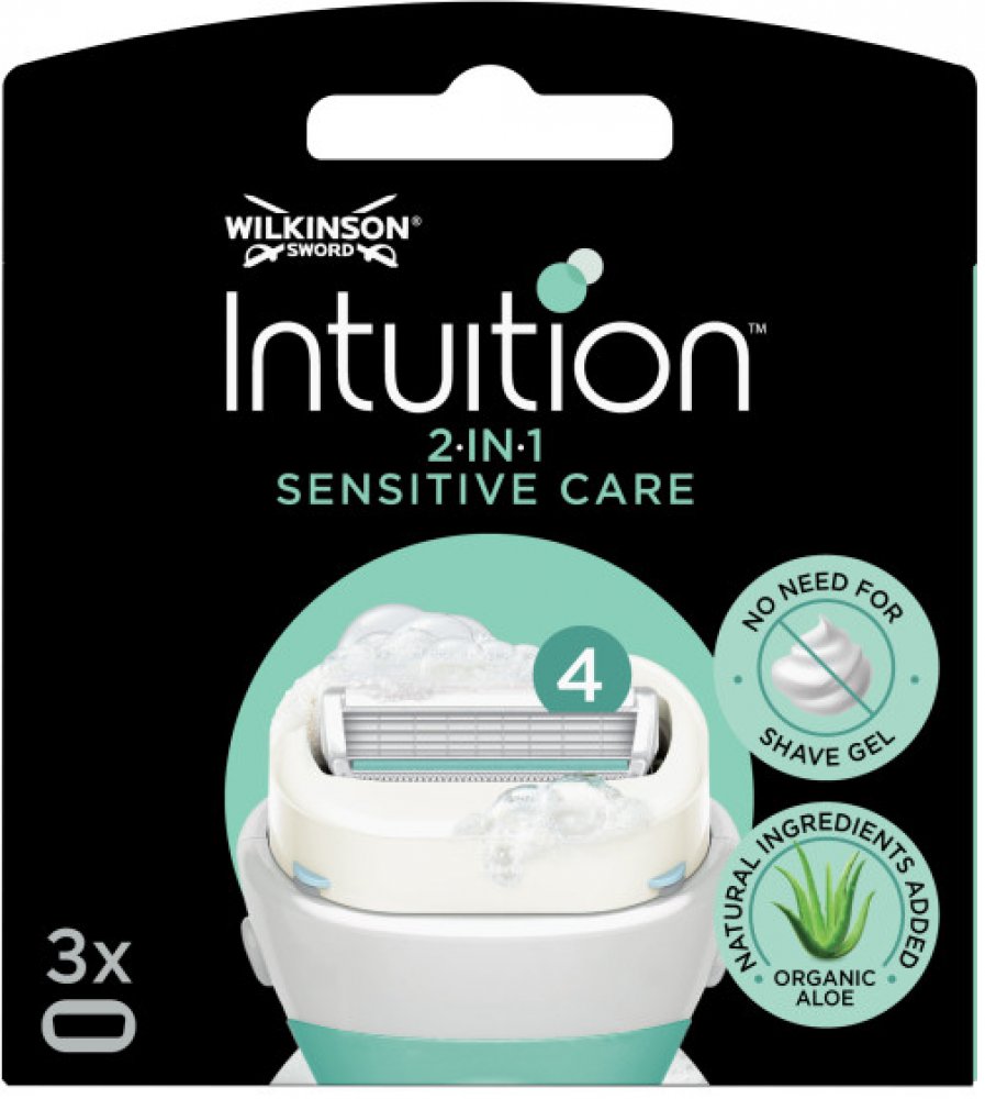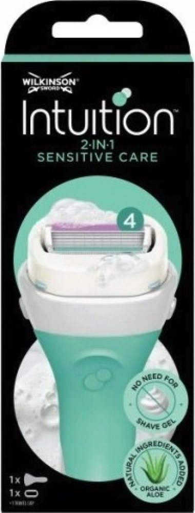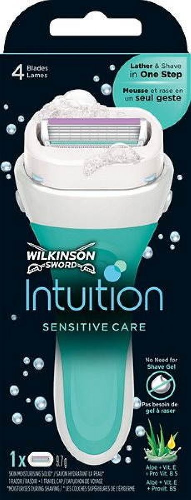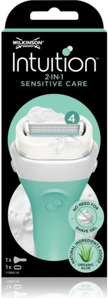 Holicí strojek **Wilkinson Intuition Sensitive Care** obsahuje čtyři břity pro rychlé oholení. Hlavice je zdokonalena o mýdlovou hlavu s výtažkem z aloe vera a vitaminem E, která intenzivně hydratuje pokožku, čímž pomáhá předcházet podráždění způsobeném holením. Mýdlová hlava nahrazuje použití mýdlové pěny nebo gelu. Tvar hlavice se přizpůsobí tělu a oholí i těžko přístupná místa.