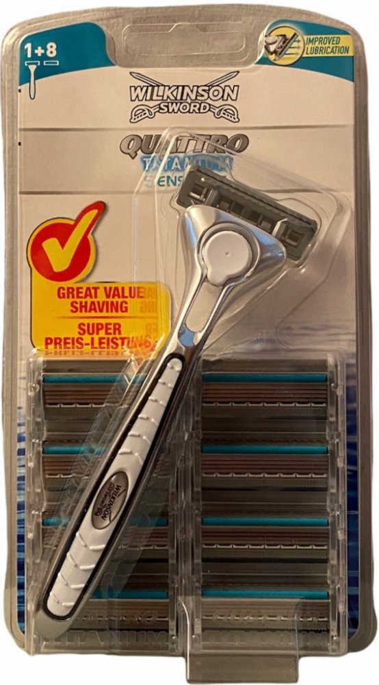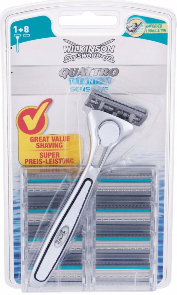 Oholte se s holicím strojkem a břity ze setu **Wilkinson Sword Quattro Essential 4**: ### Holicí strojek s jednou hlavicí Quattro Essential 4 1 ks Holicí strojek **Quattro Quattro Essential 4** dokonale oholí i tu nejcitlivější tvář. Hlavice obsahuje **4 břity s titanovým povrchem** pro dokonalé oholení a **hydratační pásek** s aloe vera, jojobovým olejem, vitamínem E a B5, které pokožk