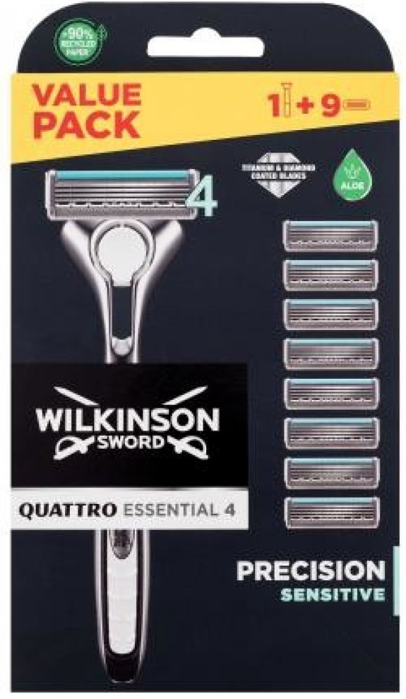 Wilkinson Sword Quattro Essential 4 sada holicí strojek s jednou hlavicí 1 ks + náhradní hlavice 8 ks pro muže.