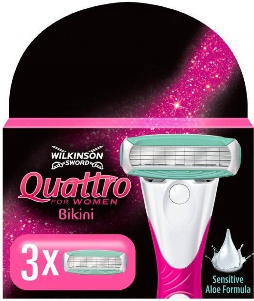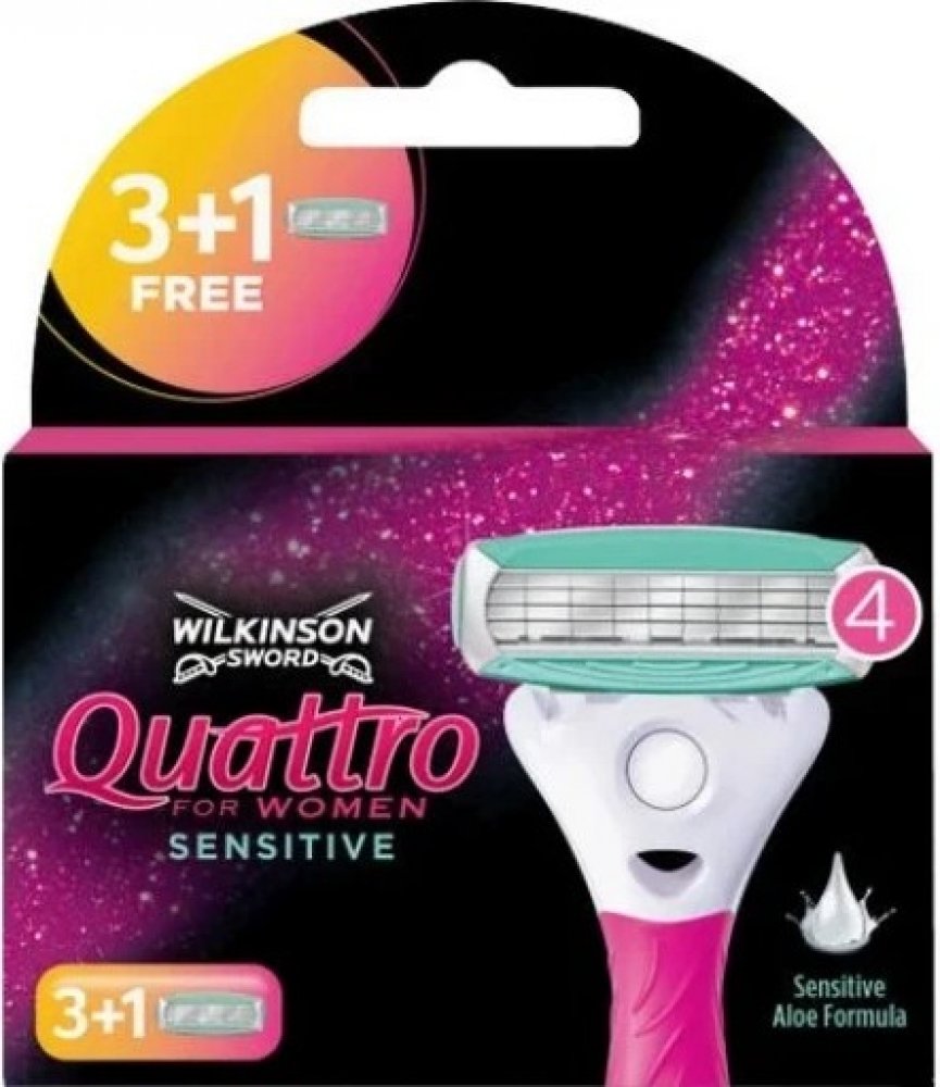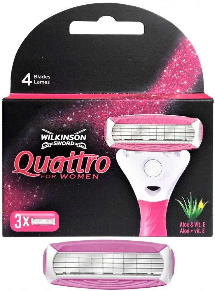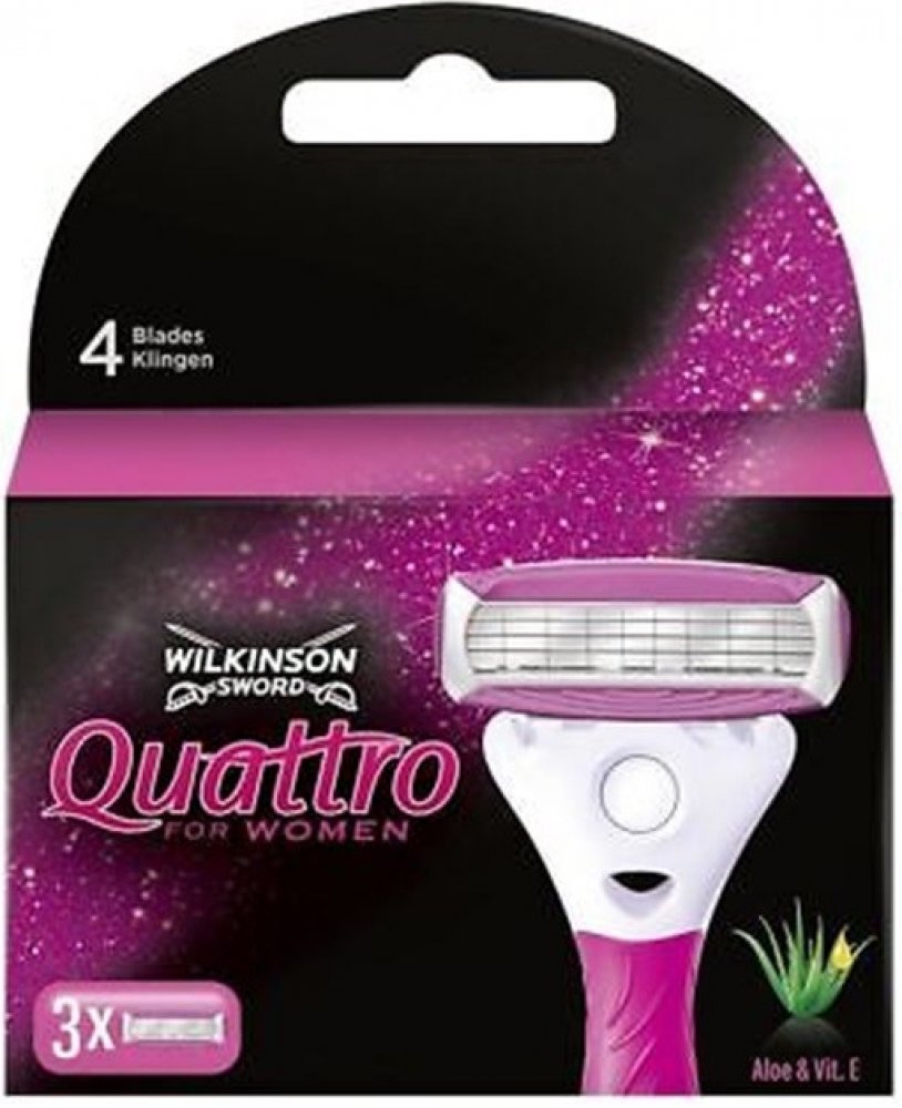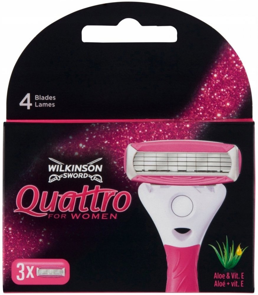Náhradní hlavice se čtyřmi břity pro holicí strojek Wilkinson Sword Quattro for Women zajistí sametově hebkou pokožku v podpaží, na nohou a v oblasti bikin až po dobu několika dní. Zvlhčující proužky s aloe vera a vitamínem E zajistí šetrné oholení. Speciální ochranná mřížka na břitech zajišťuje dodatečnou ochranu před kožním podrážděním a zraněními vzniklými říznutím žiletkou.